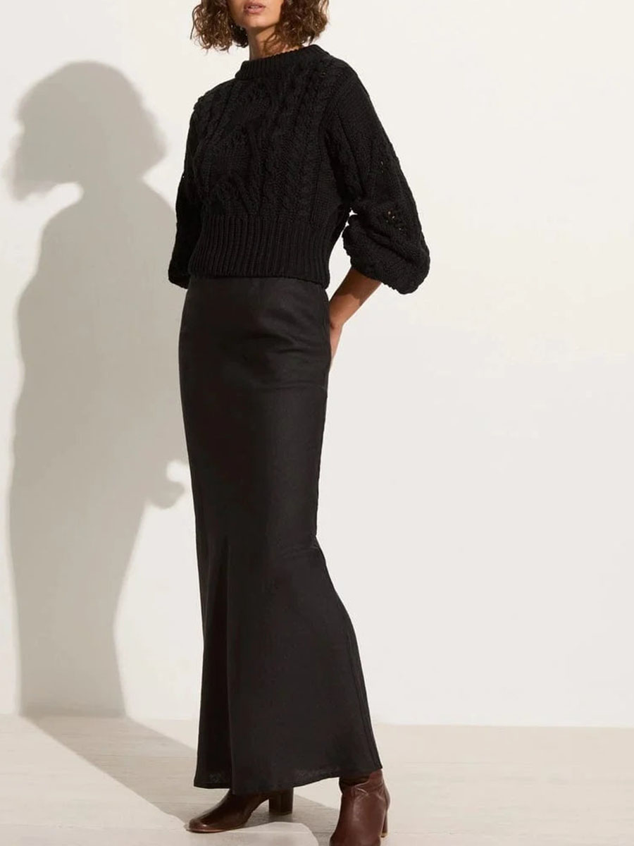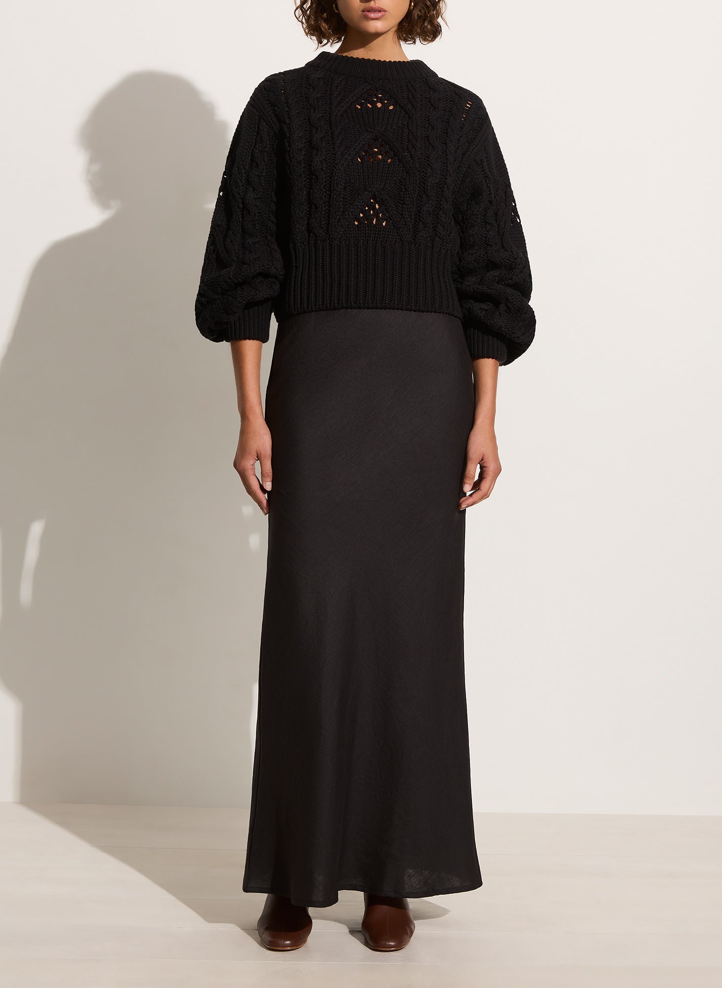 Embrace winter layering with new knitwear. The Knit Jumper in is hand-woven from 100% cotton yarn and offers a relaxed silhouette defined with a slightly cropped length, voluminous long sleeves and ribbed cuff details. Artisanally woven with a cable-knit design throughout, the effortlessly styles with wardrobe staples for the day or over a slip dress for the cooler nights.