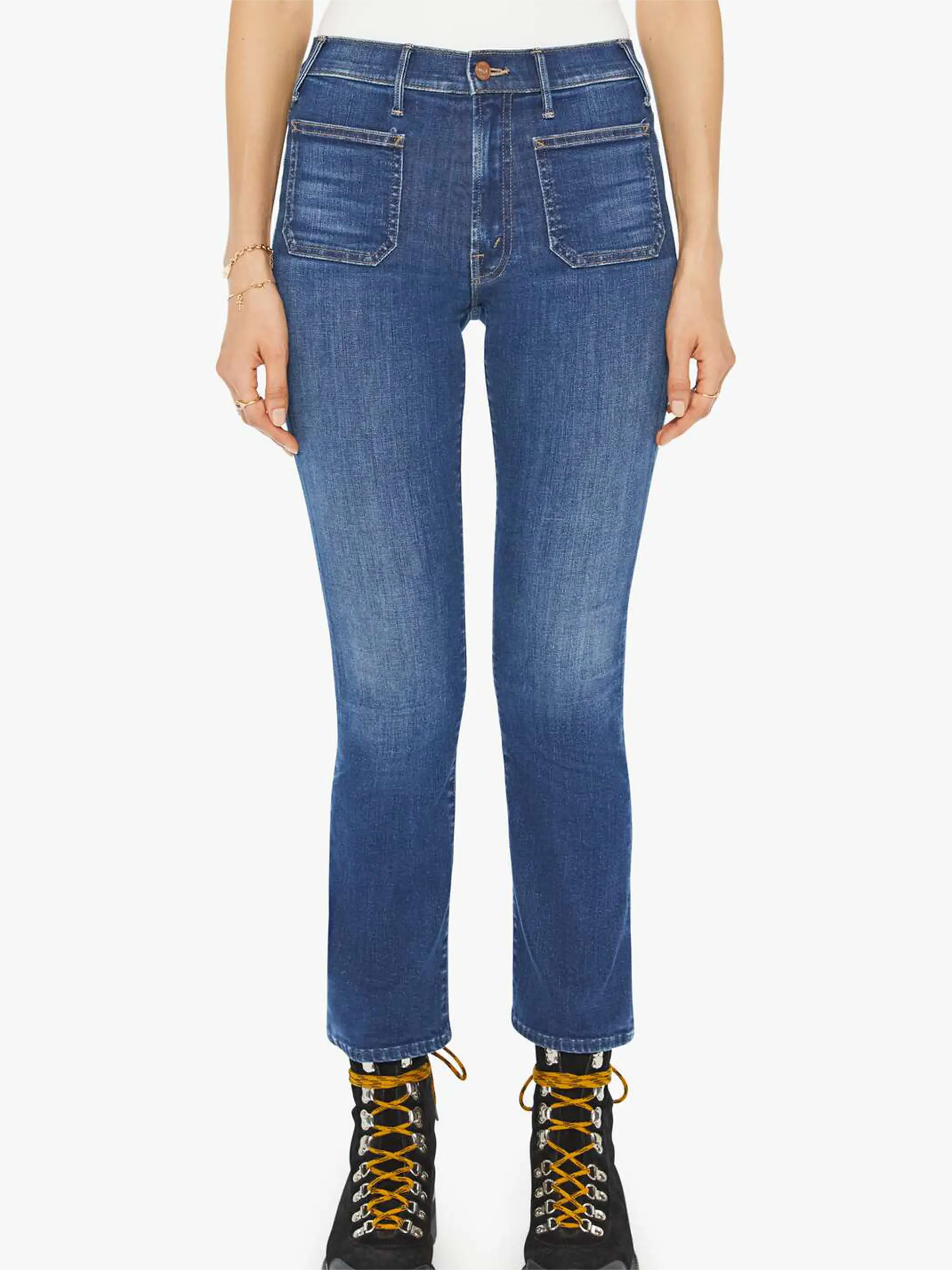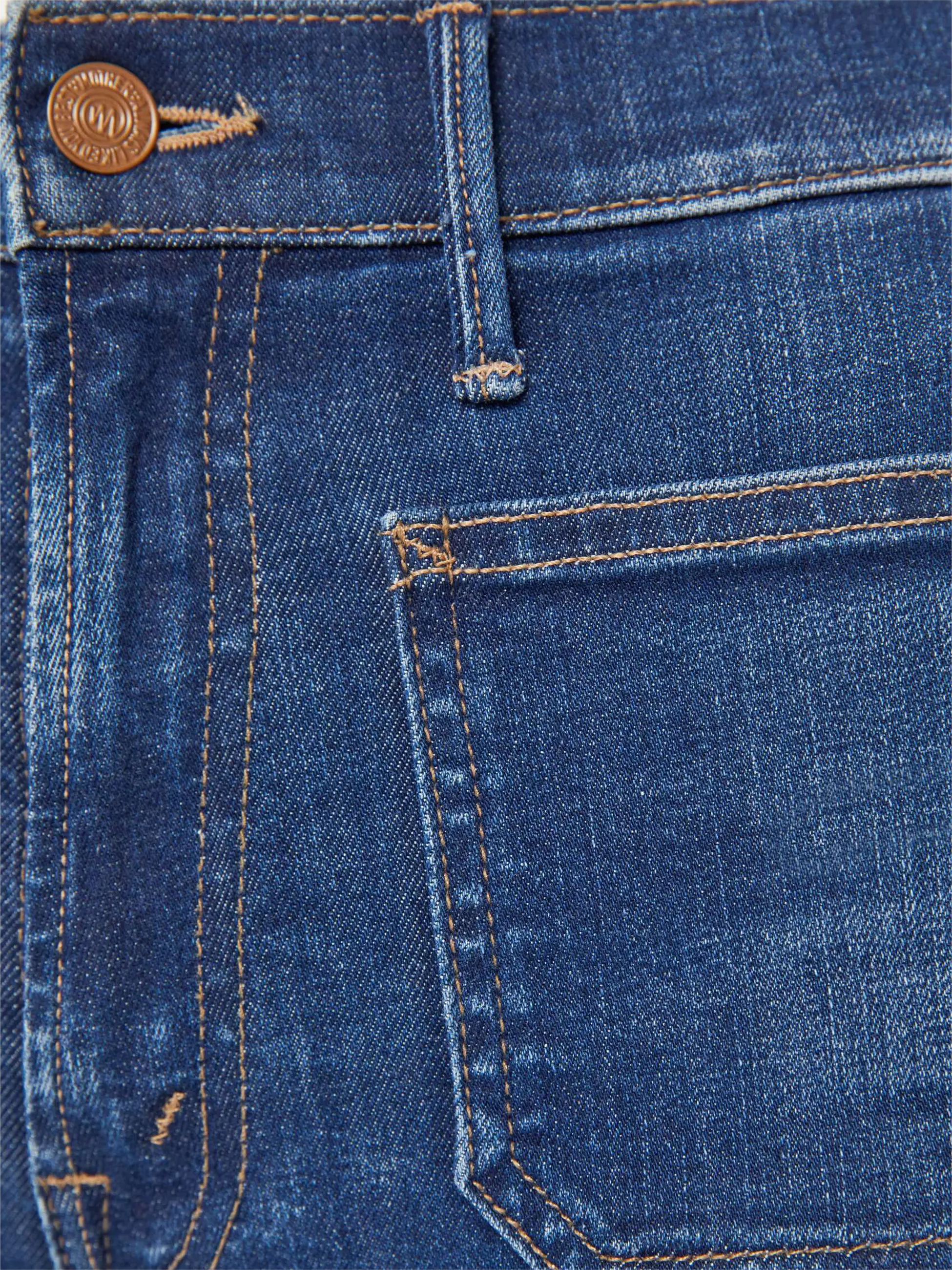 The patch pockets highlight the retro style of the streamlined straight leg jeans, which are made of low stretch denim and have been shortened in length.