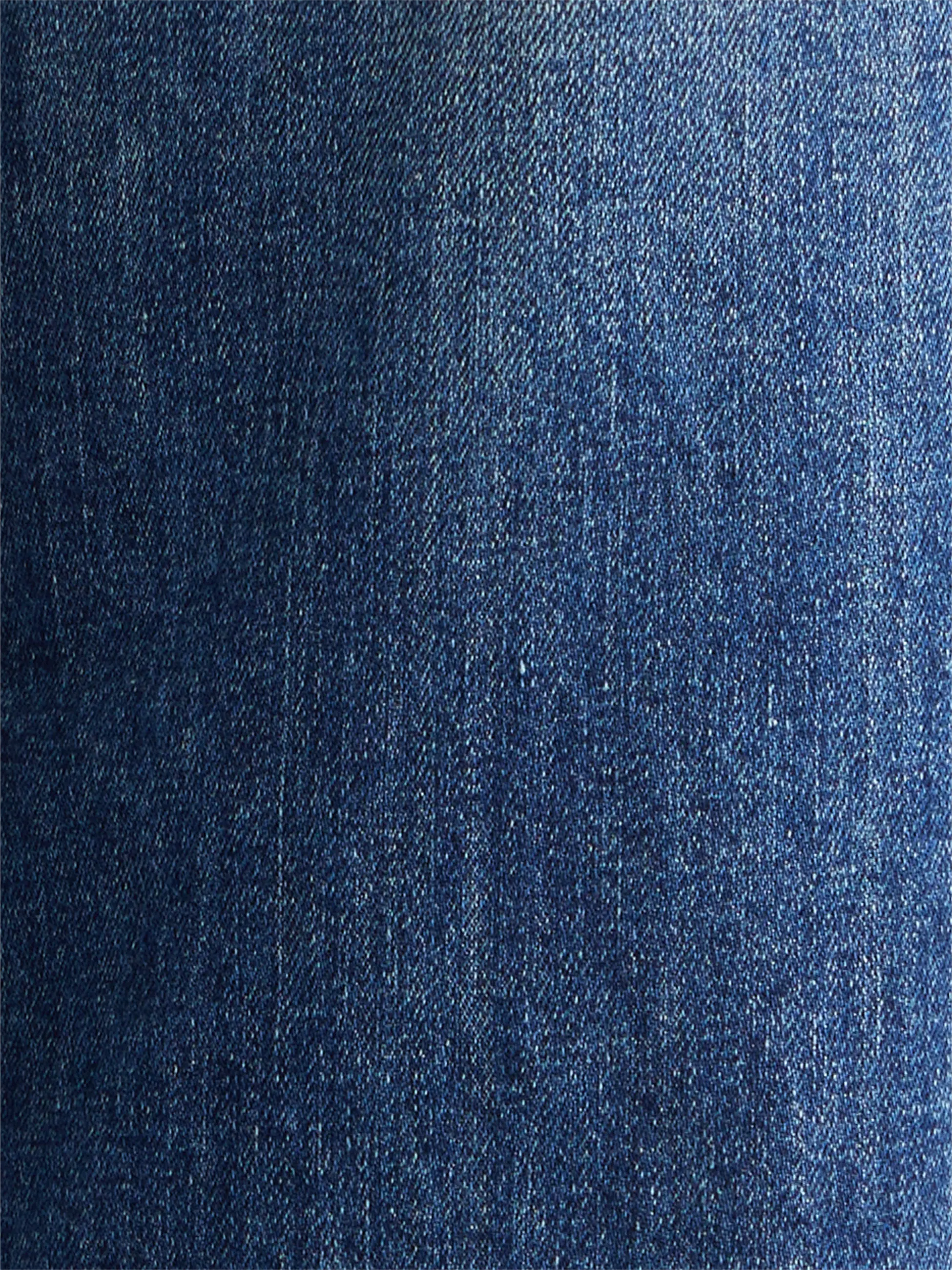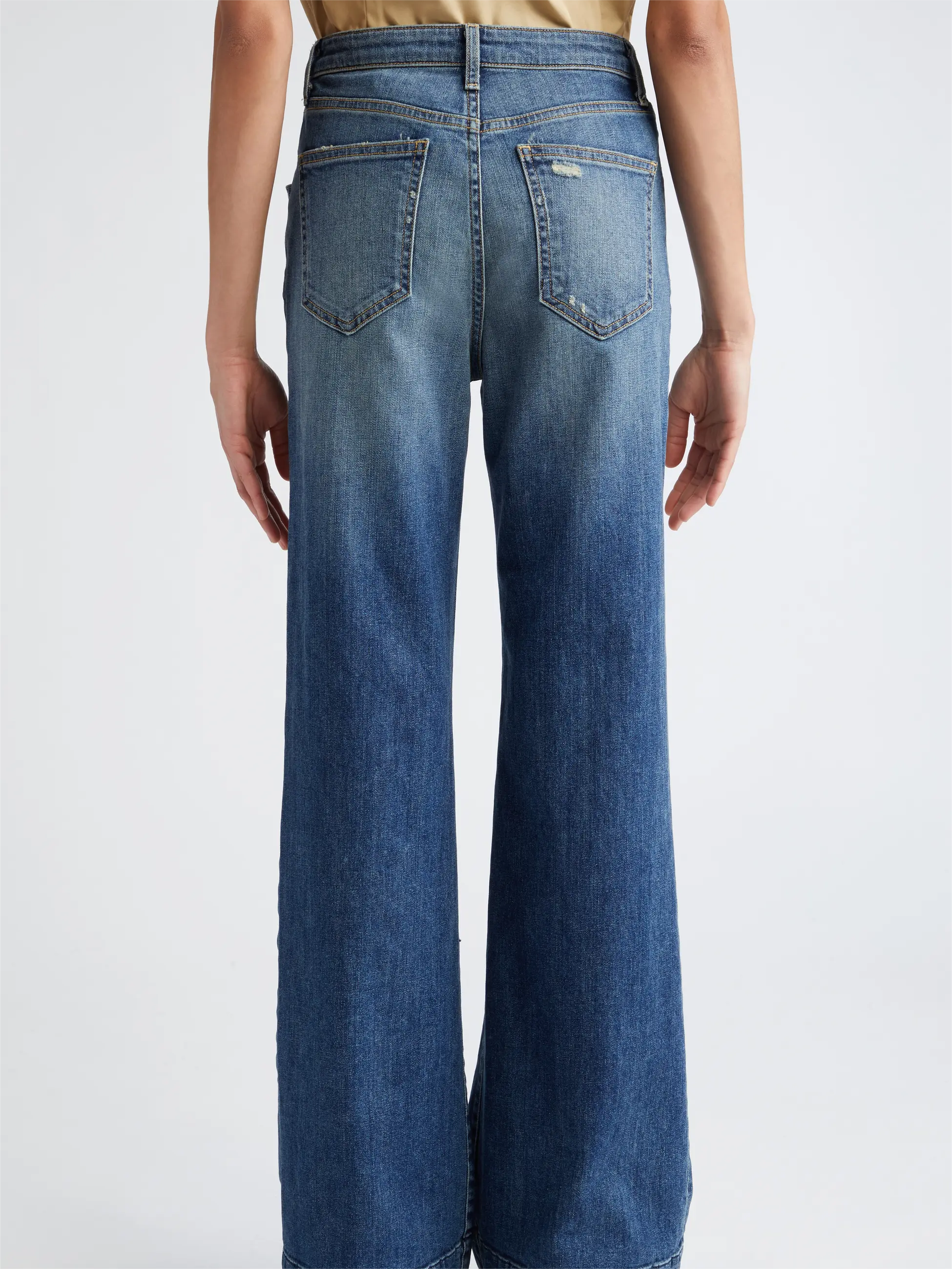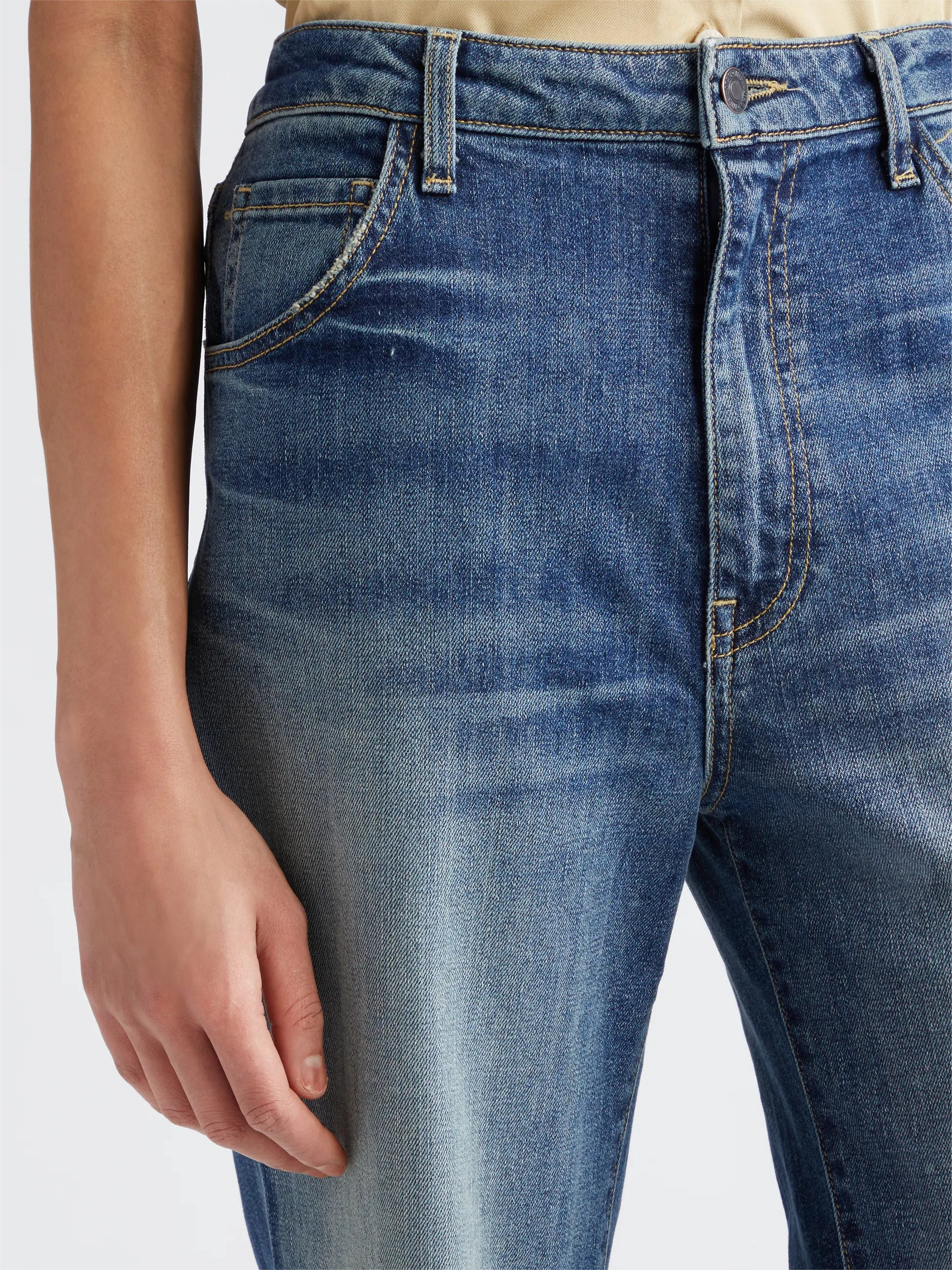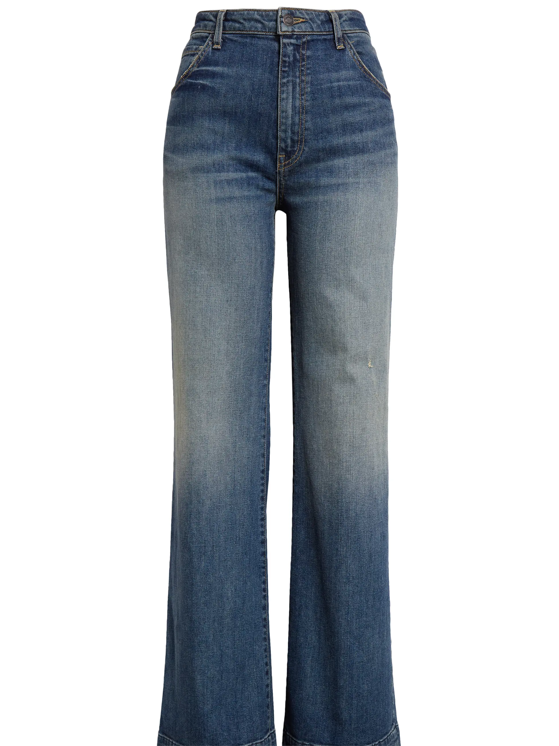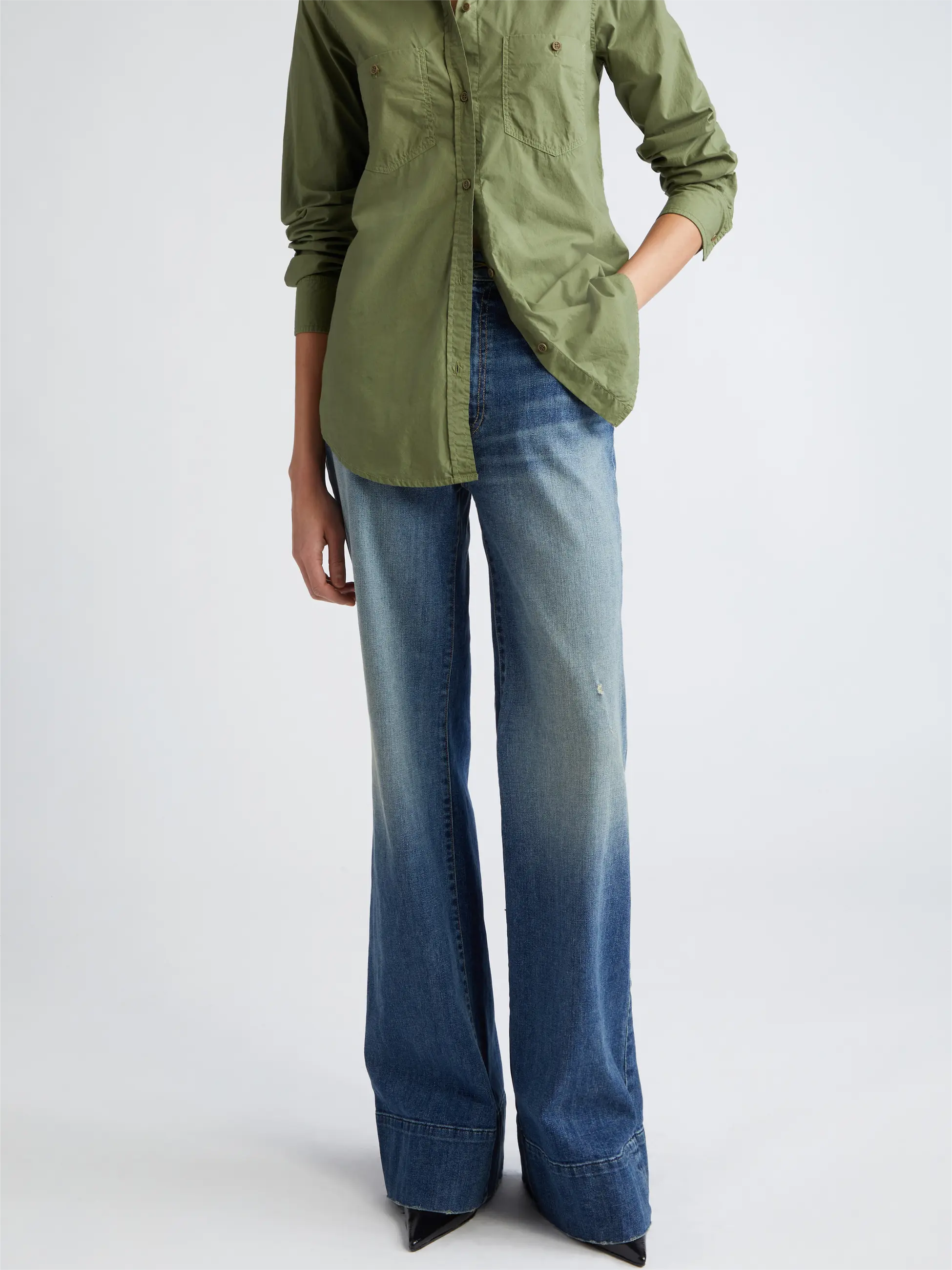 In these perfectly faded jeans, extrawide hems match the extreme sweep of the leg silhouette.