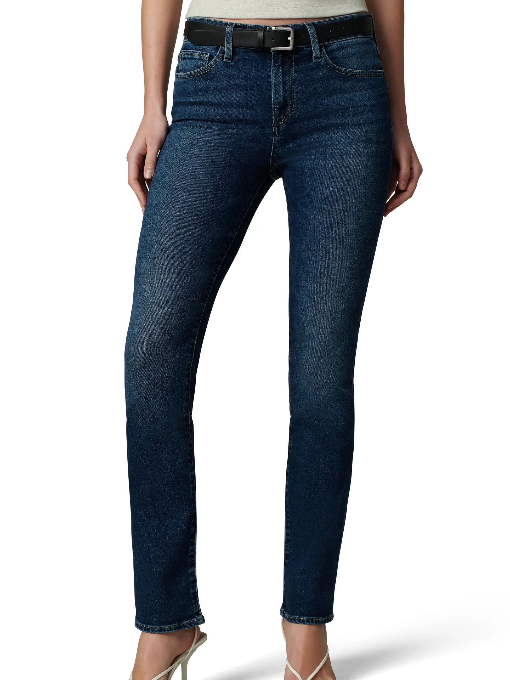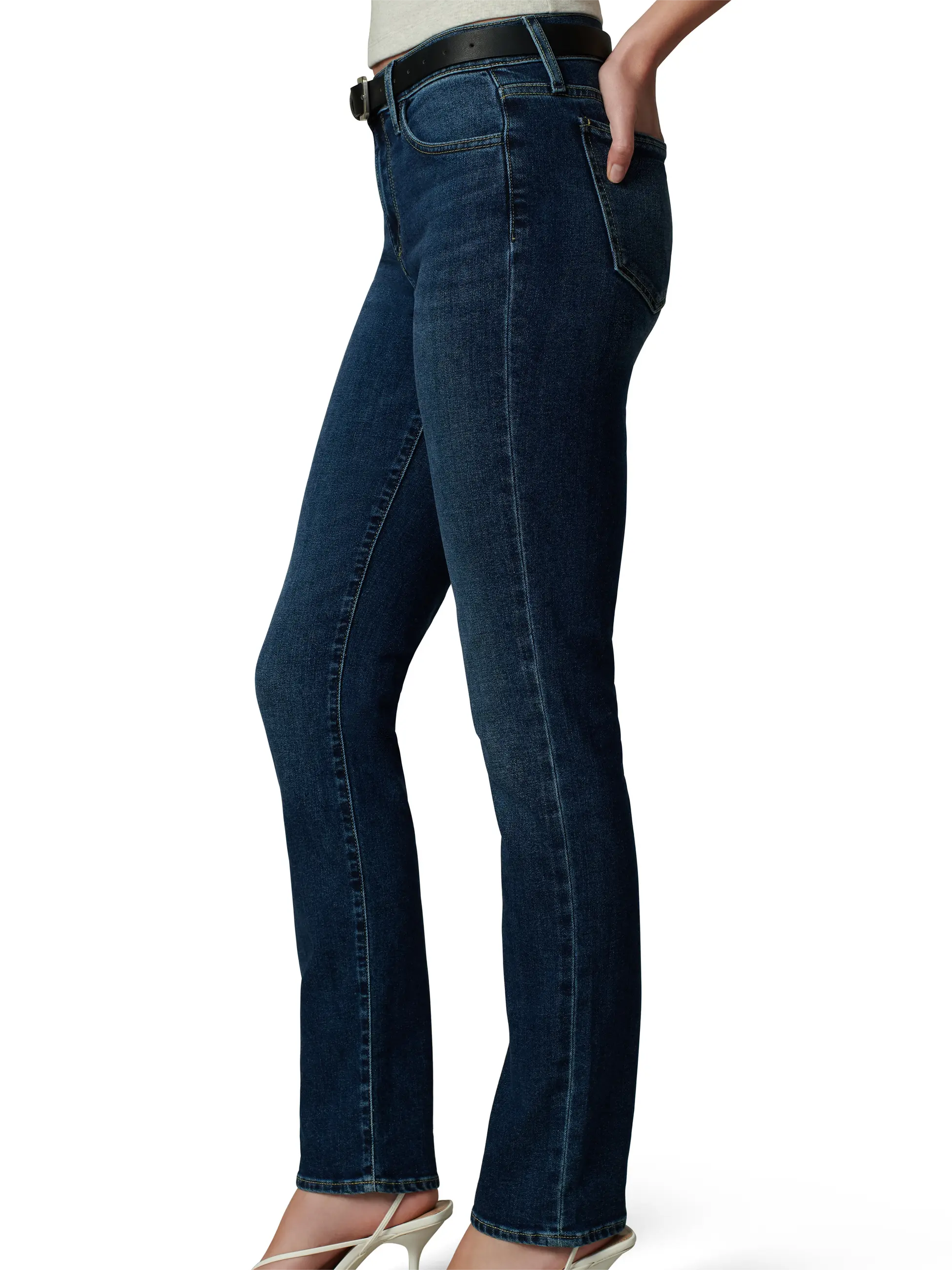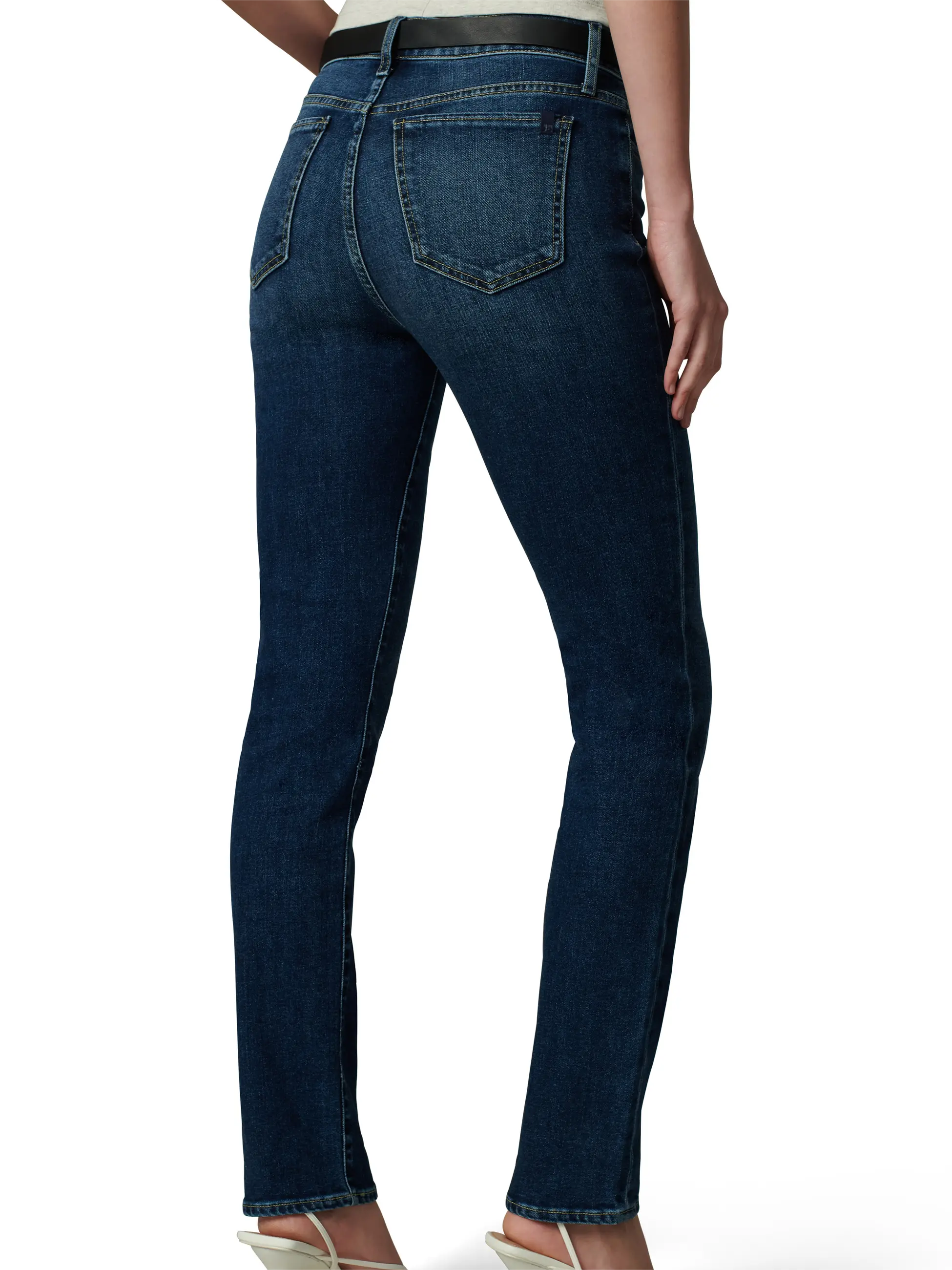 Dark-wash stretch denim lends a sophisticated look to mid-rise, full-length jeans that are fitted through the thighs and slightly looser around the ankles.