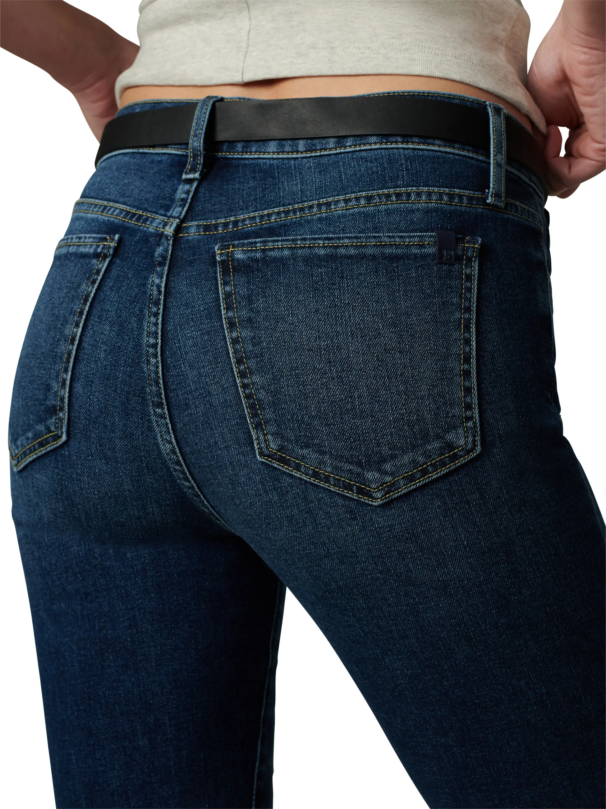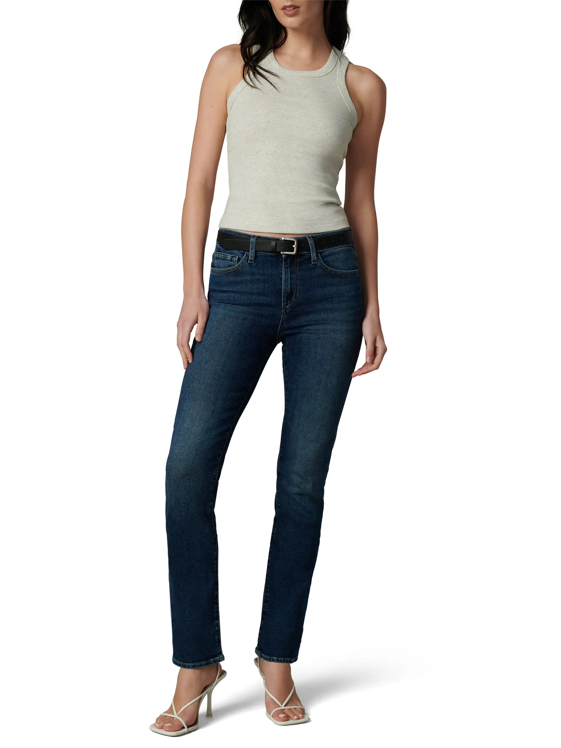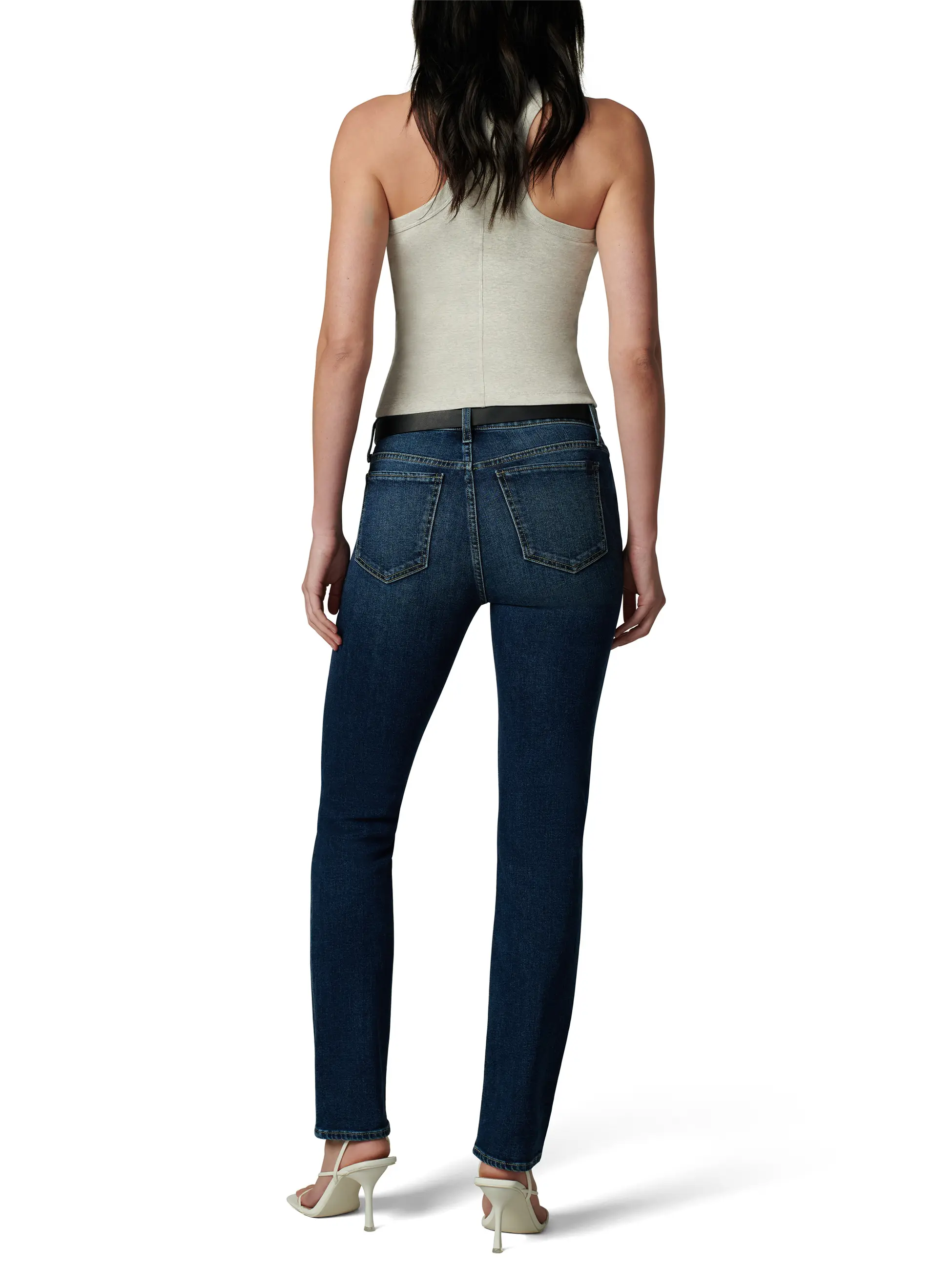 Dark-wash stretch denim lends a sophisticated look to mid-rise, full-length jeans that are fitted through the thighs and slightly looser around the ankles.