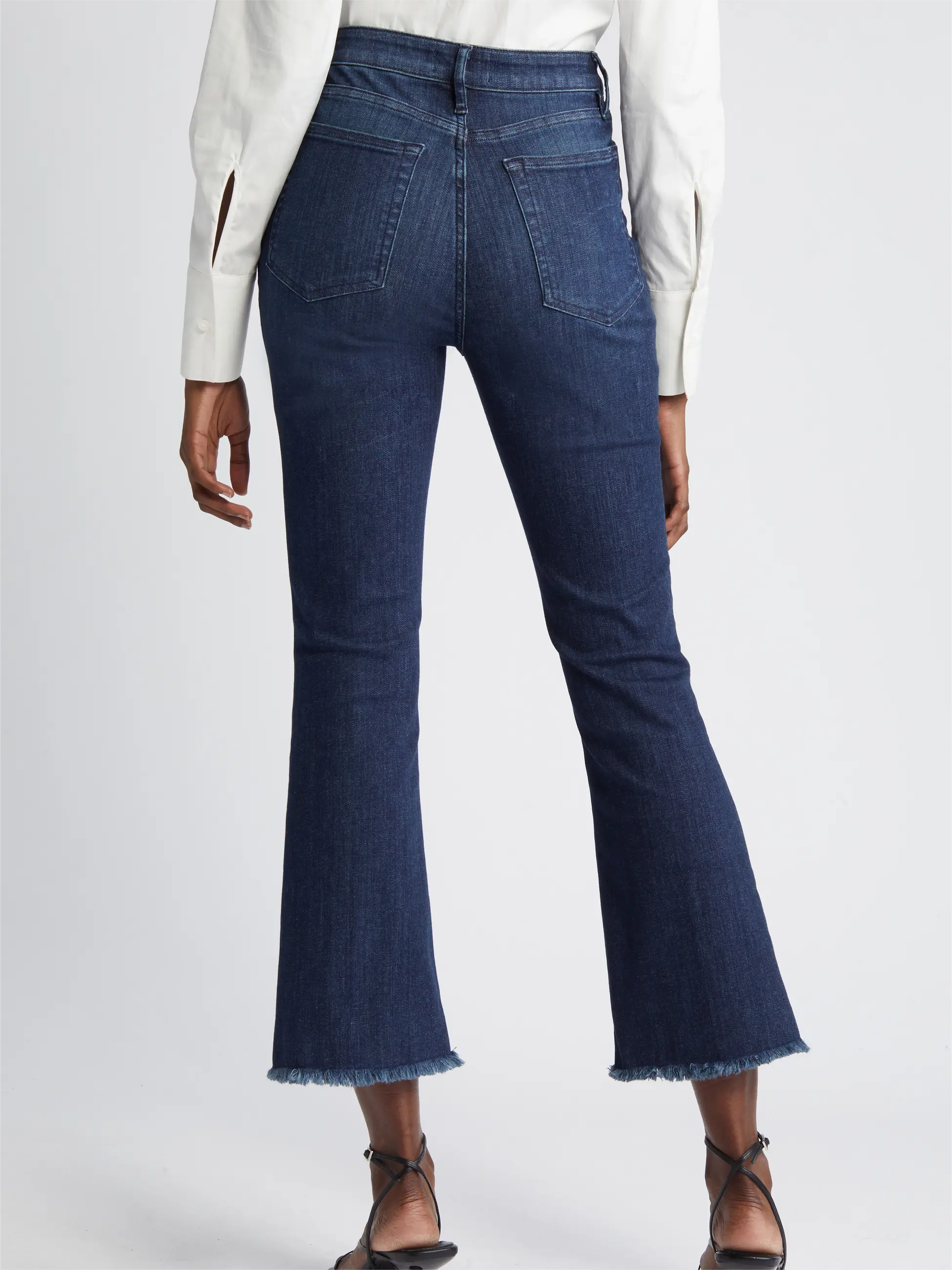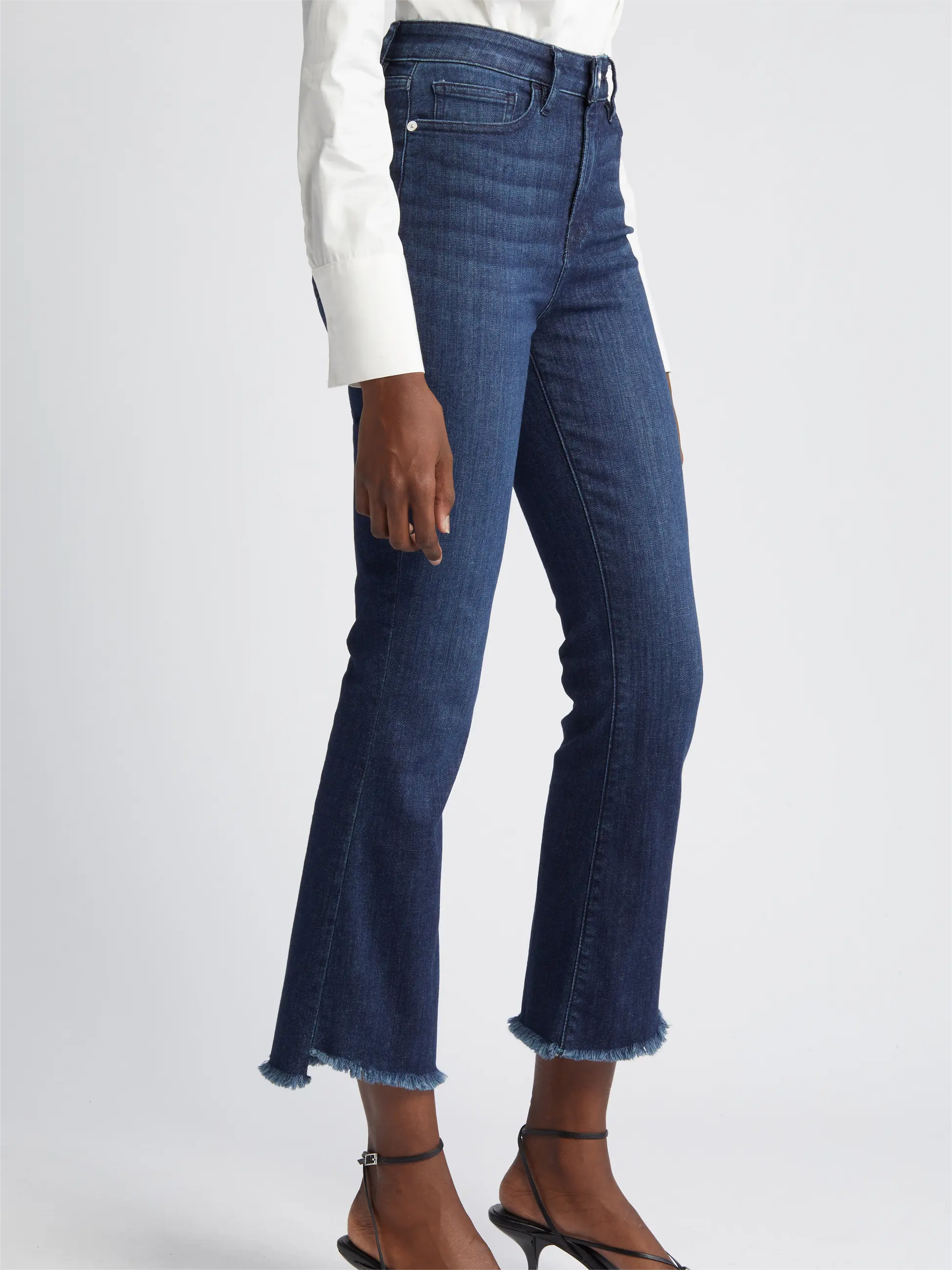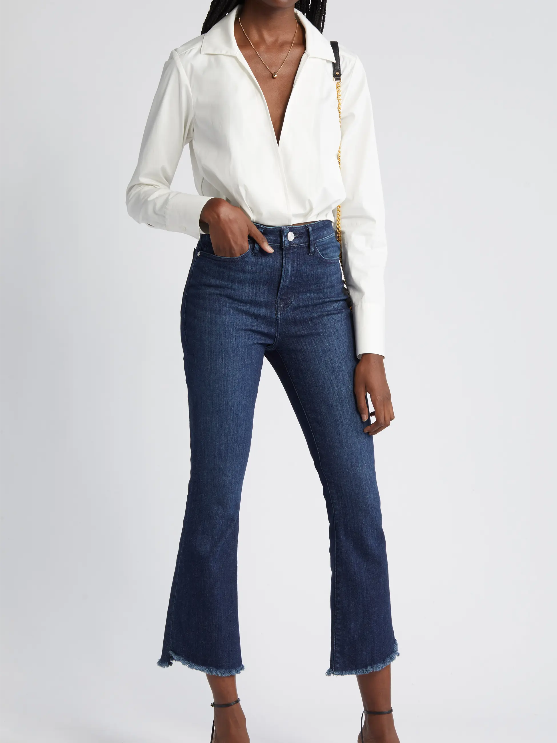 Frayed hems bring a casual edge to stretchy, cropped bootcut jeans featuring chic navy stitching and a gap-free contoured waist.