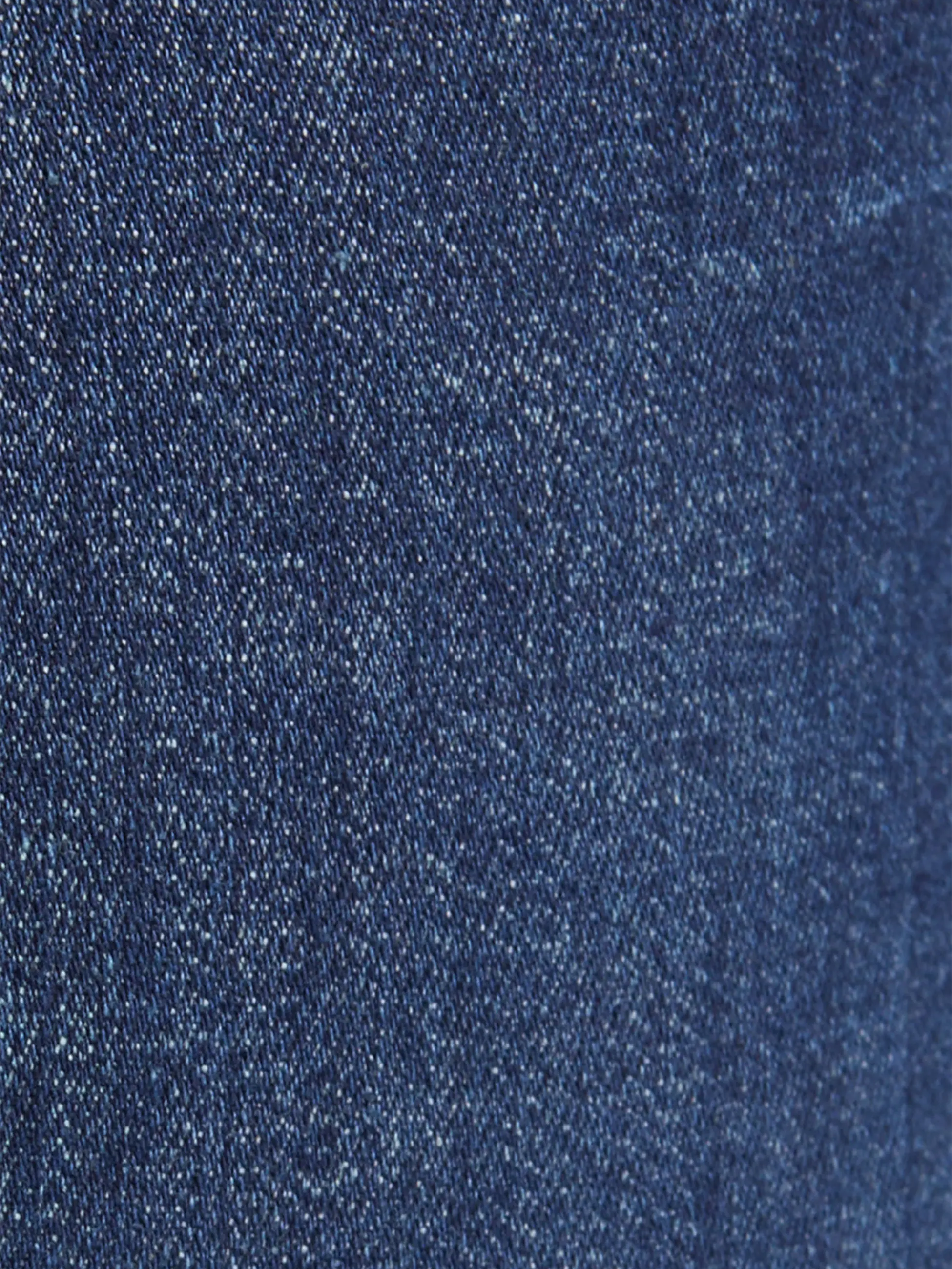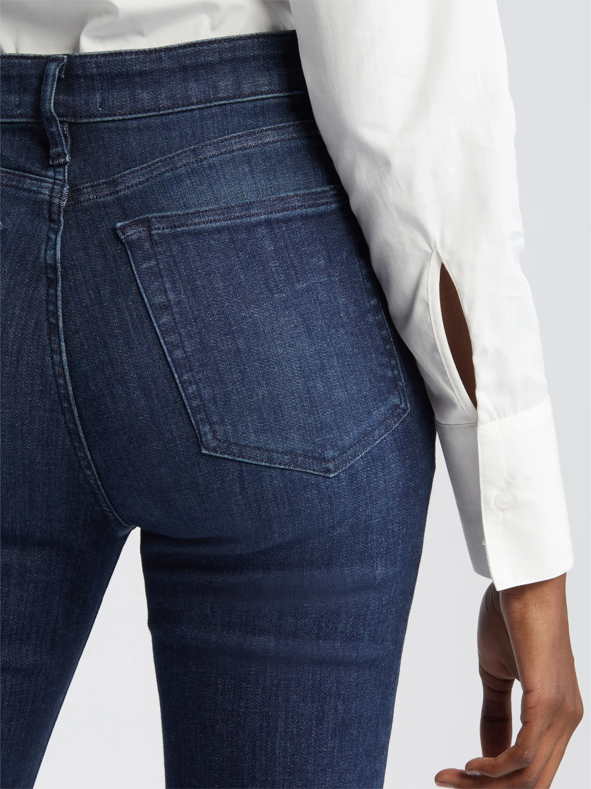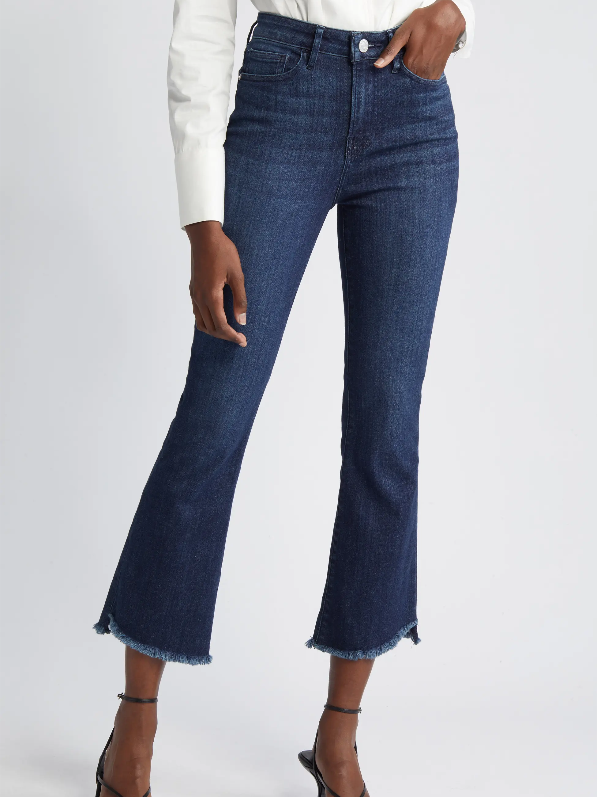 Frayed hems bring a casual edge to stretchy, cropped bootcut jeans featuring chic navy stitching and a gap-free contoured waist.