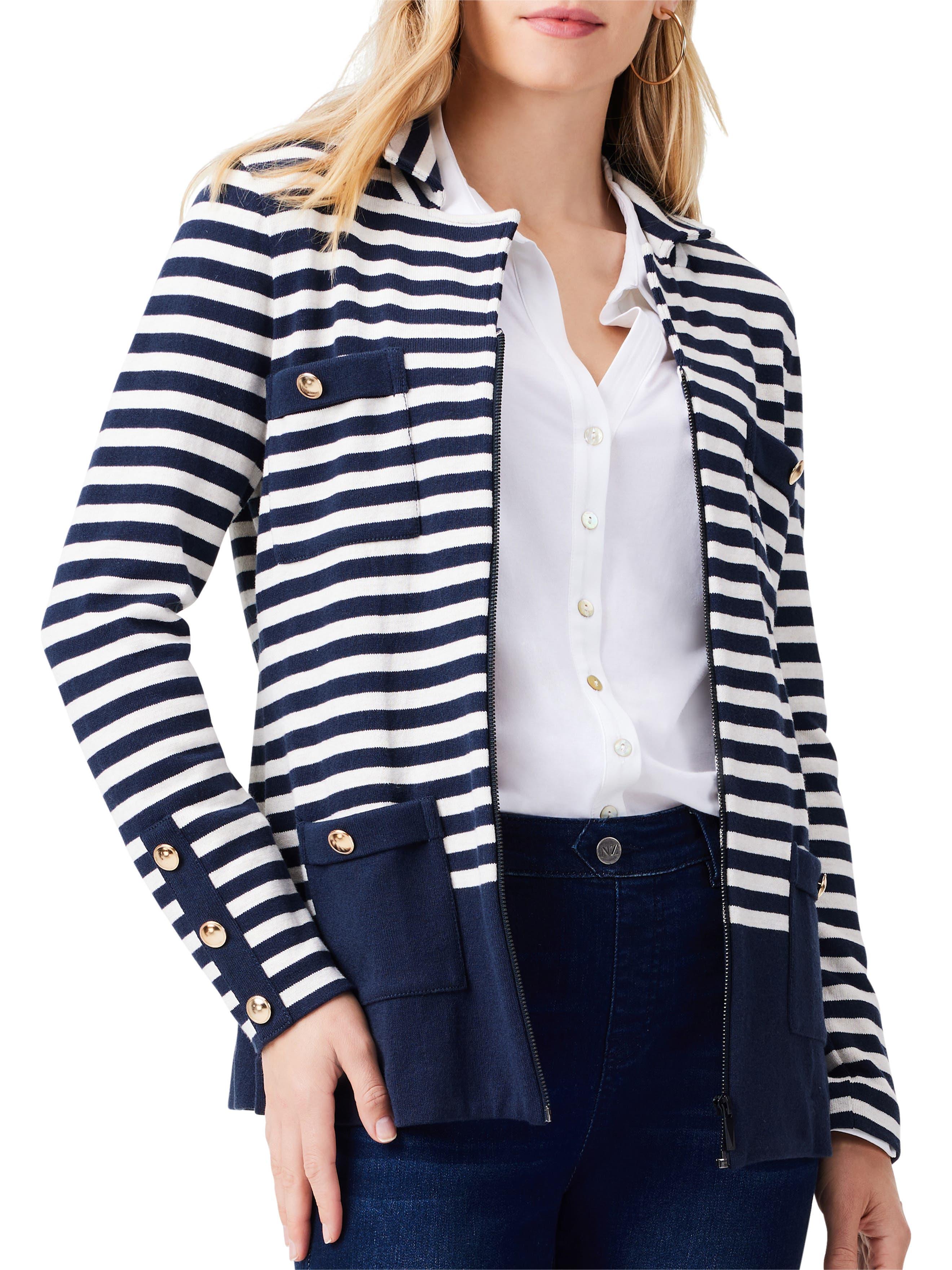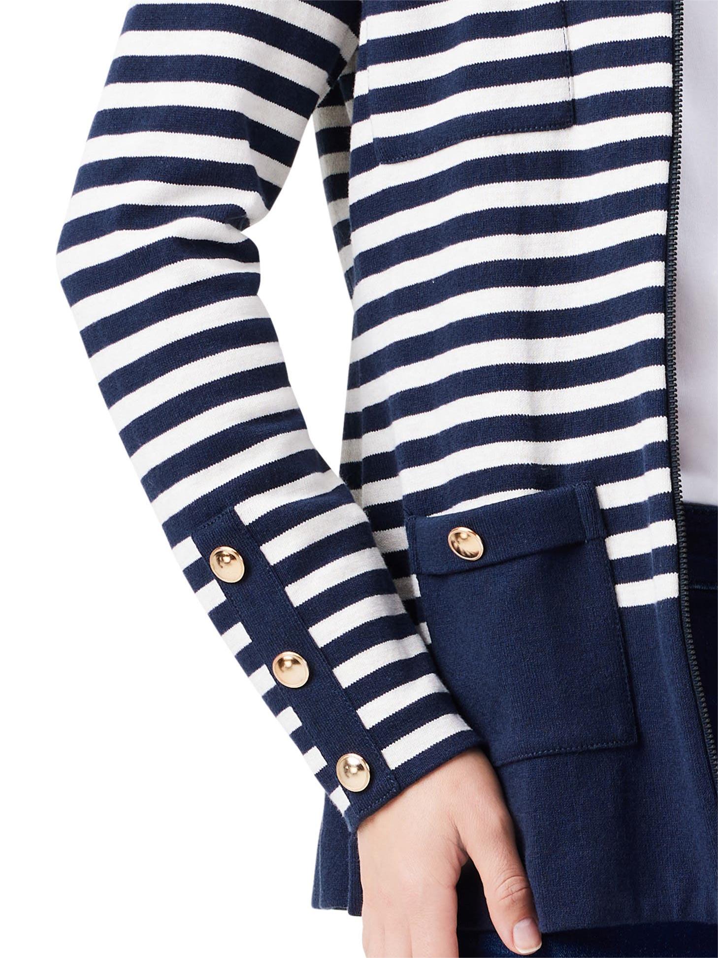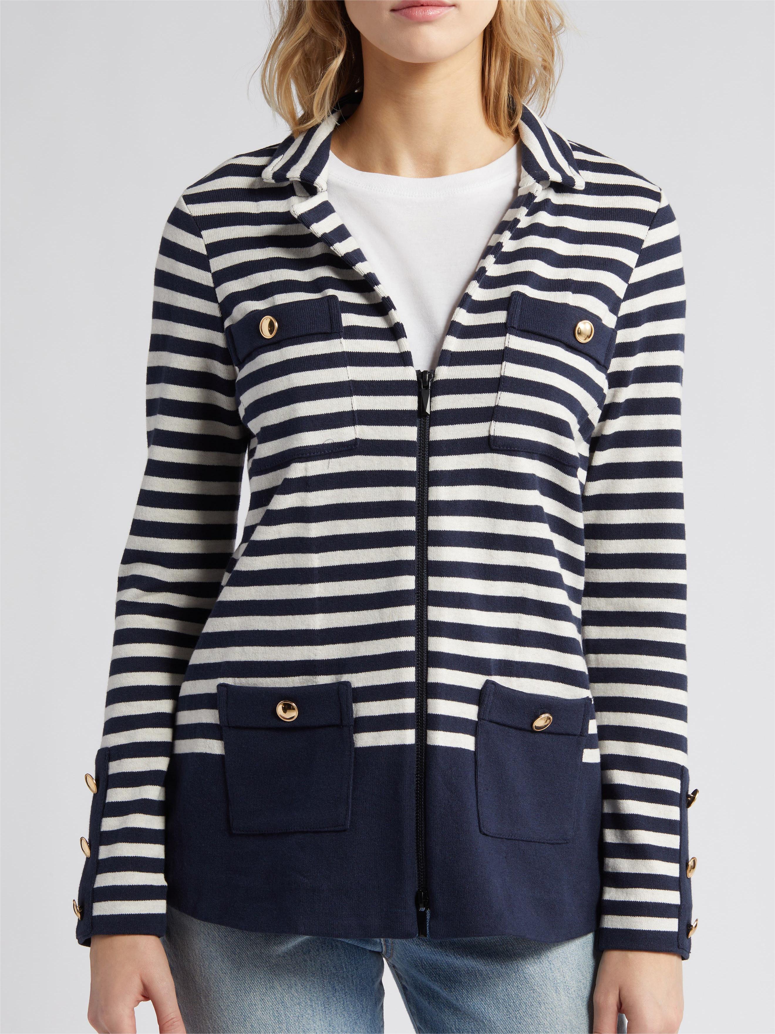 Gleaming buttons and stacked patch pockets lend modern charm to a striped cardigan fashioned with notched lapels and a two-way-zip closure.