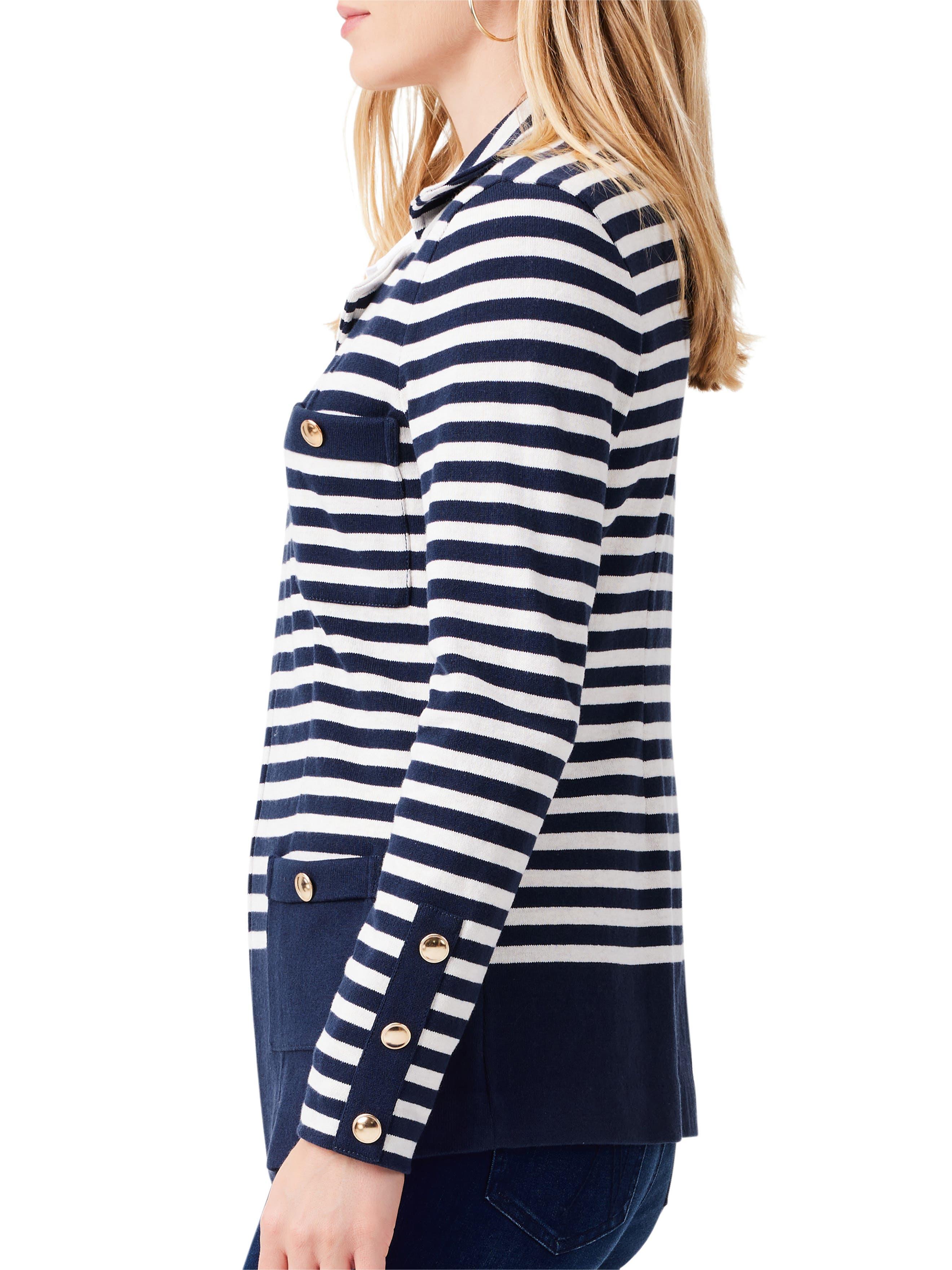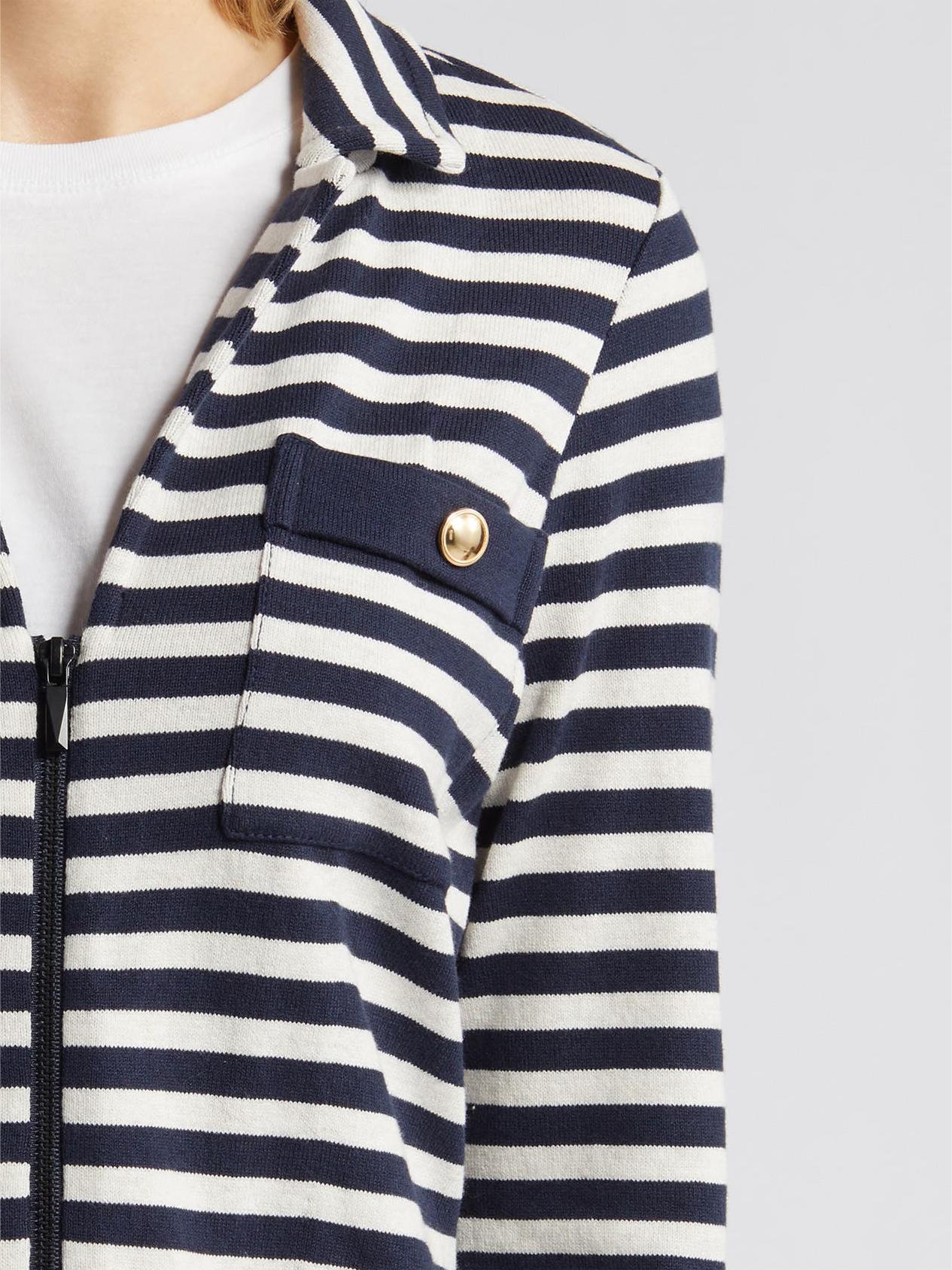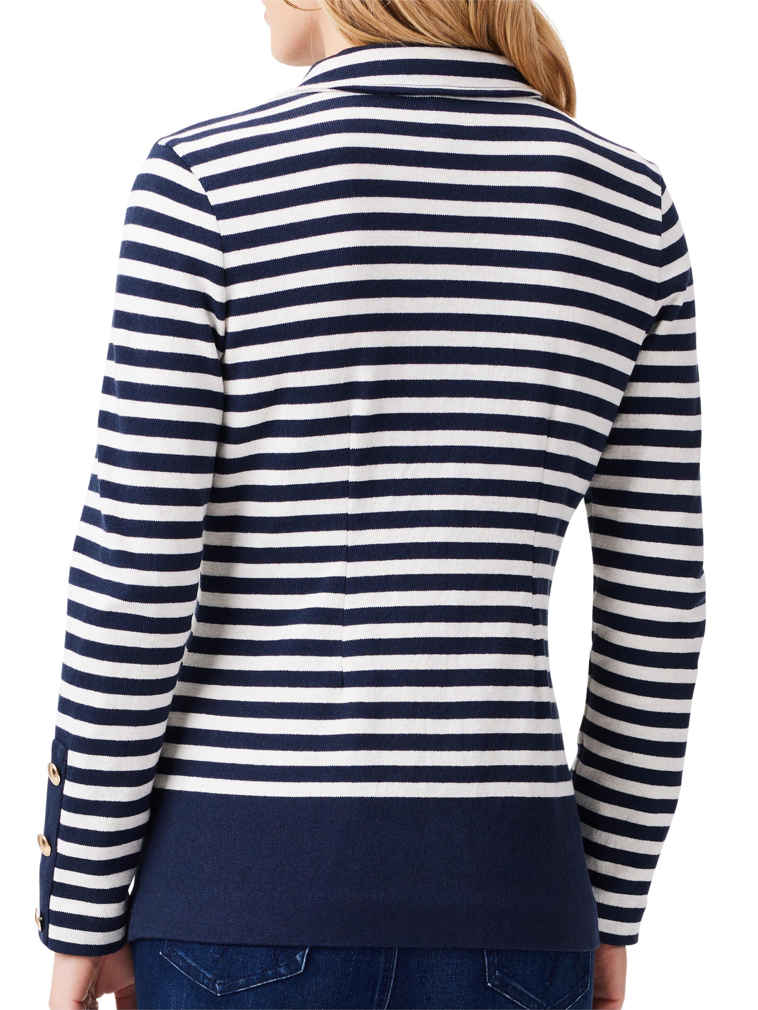 Gleaming buttons and stacked patch pockets lend modern charm to a striped cardigan fashioned with notched lapels and a two-way-zip closure.