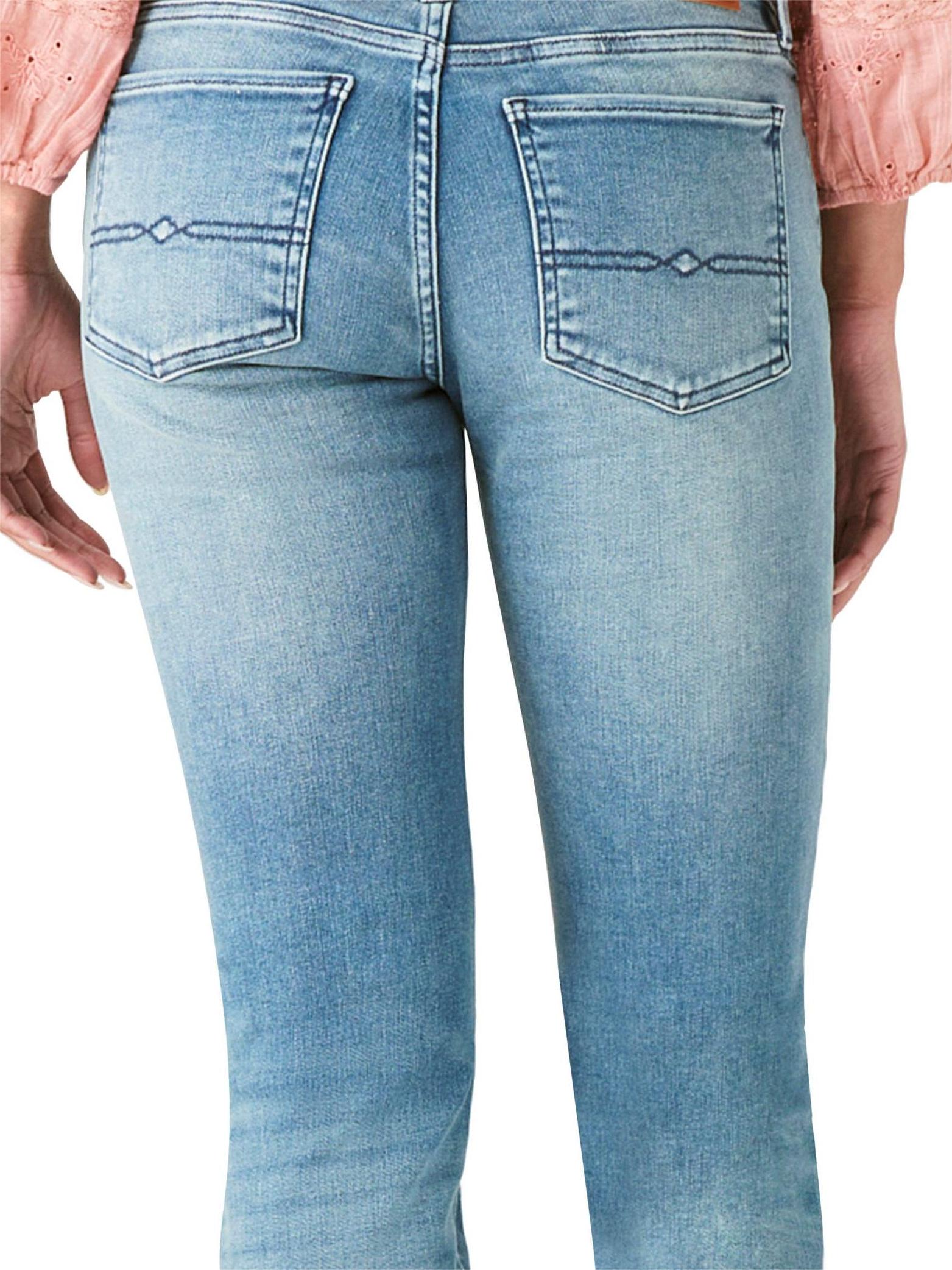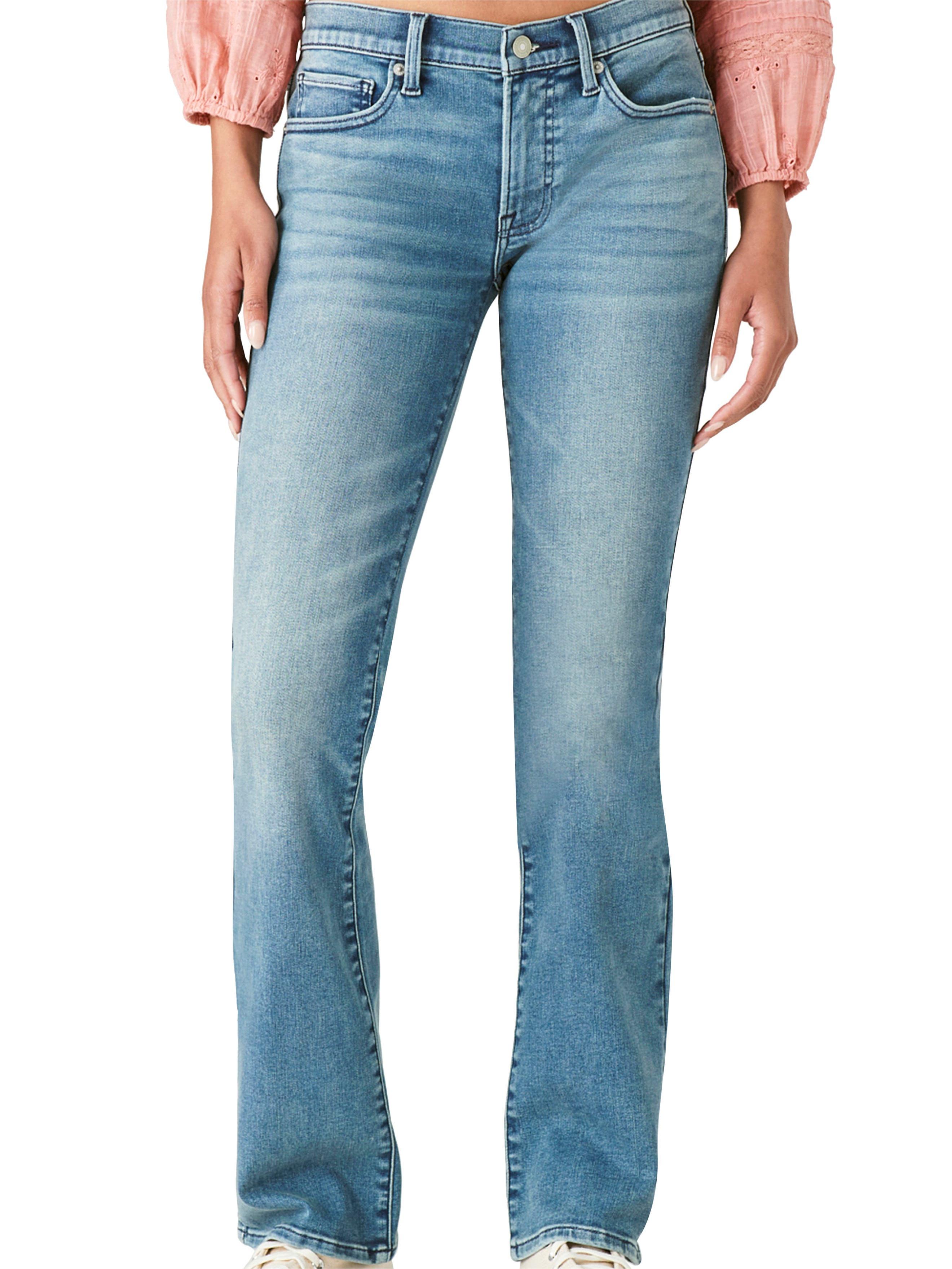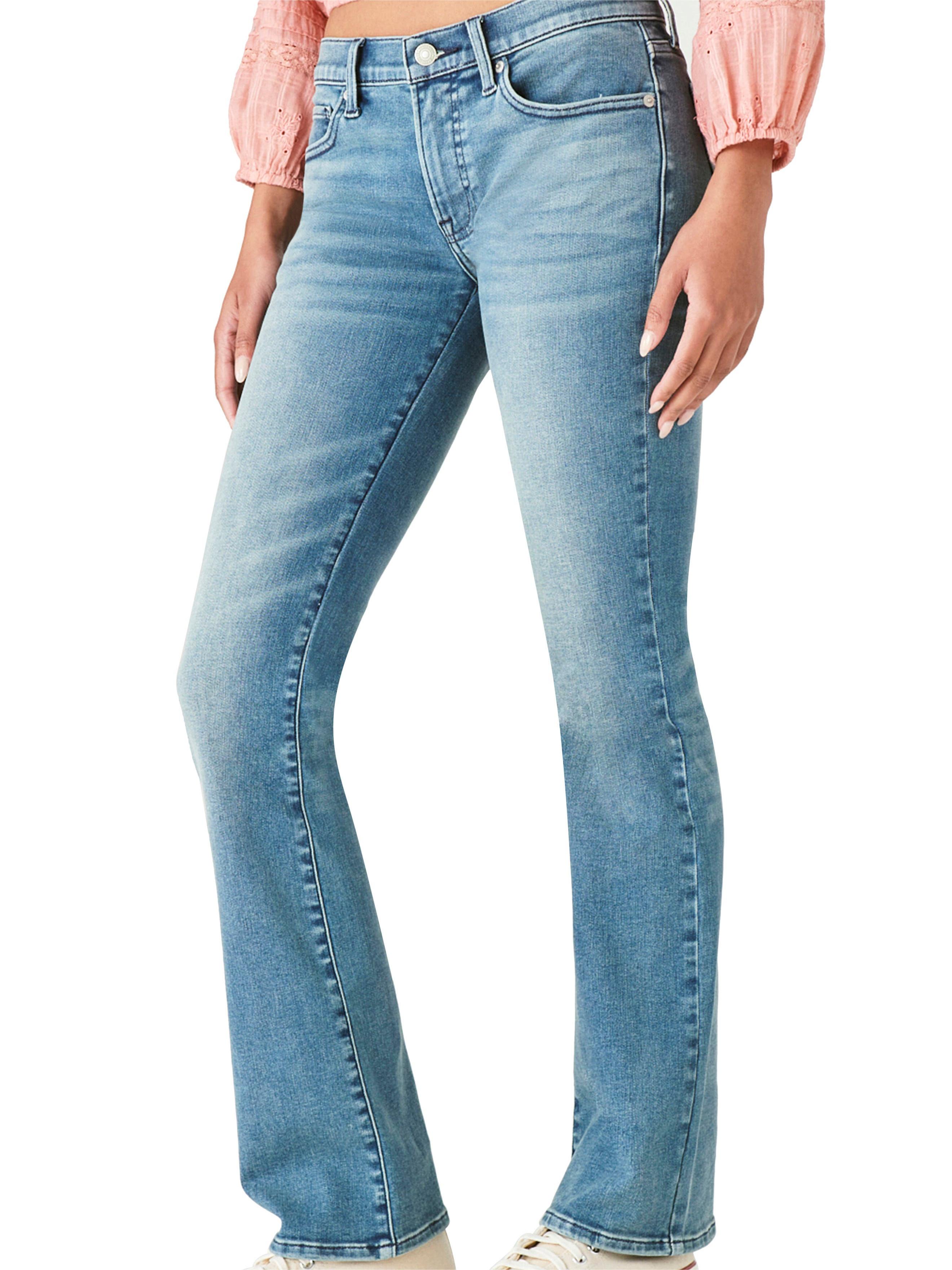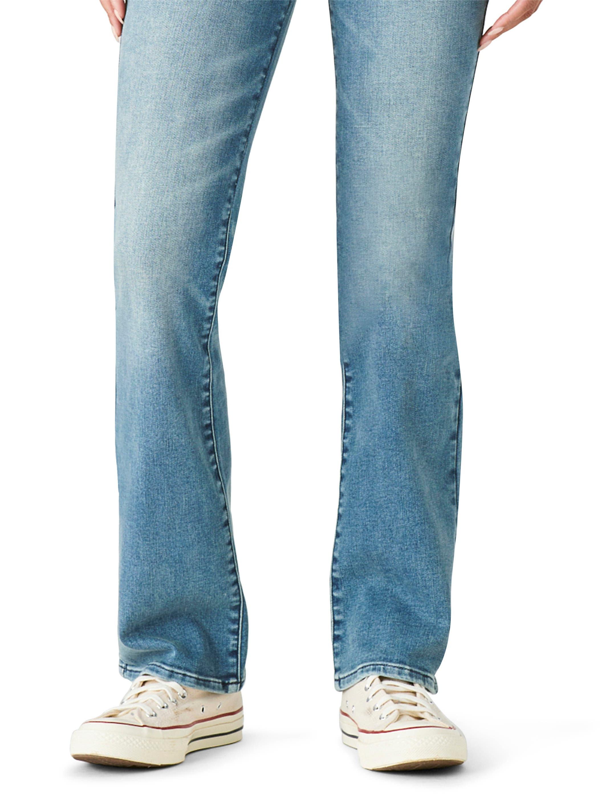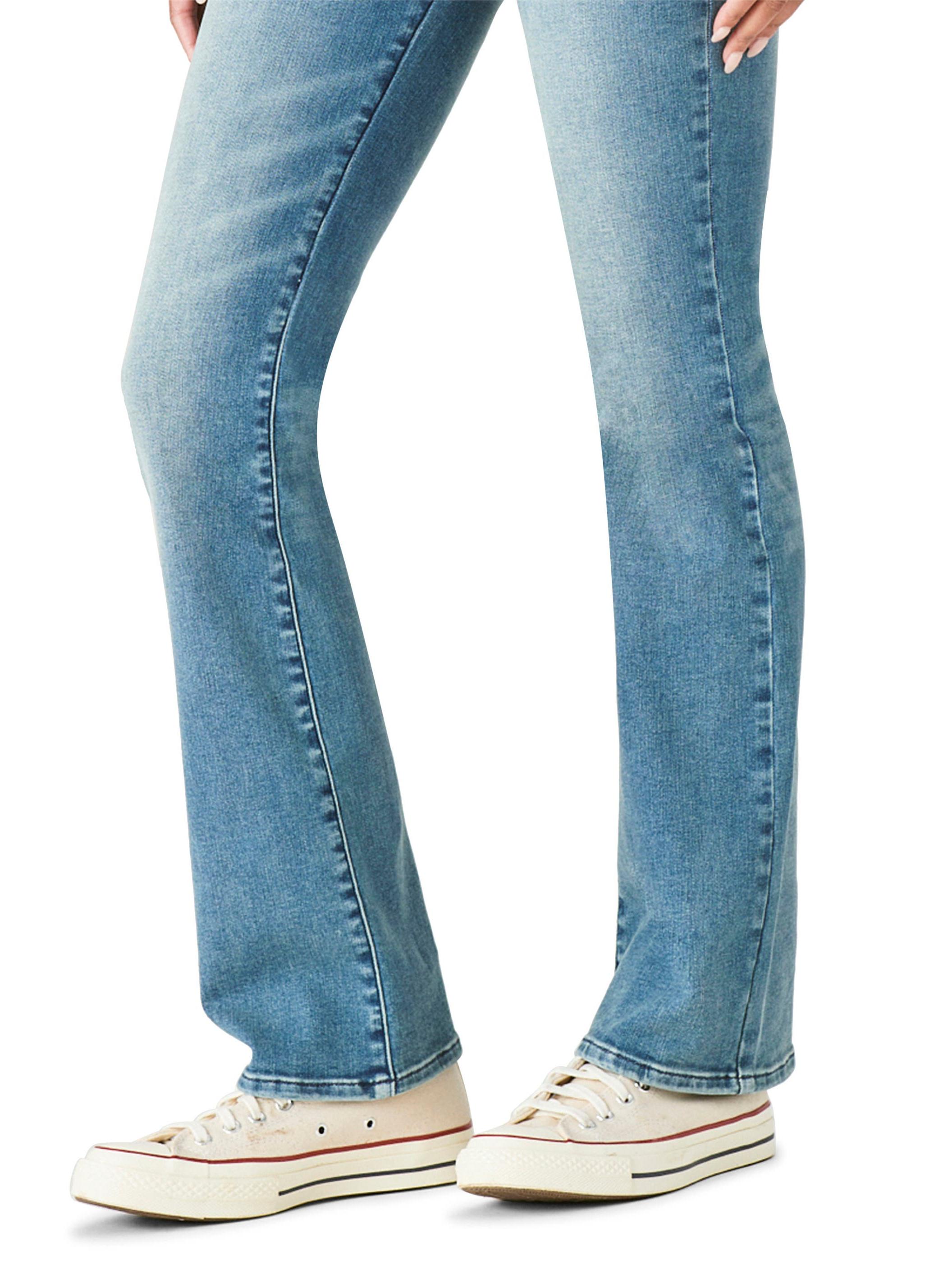 A subtle bootcut silhouette brings timeless appeal and flattering lines to comfortable stretch-denim jeans in a classically faded blue wash.