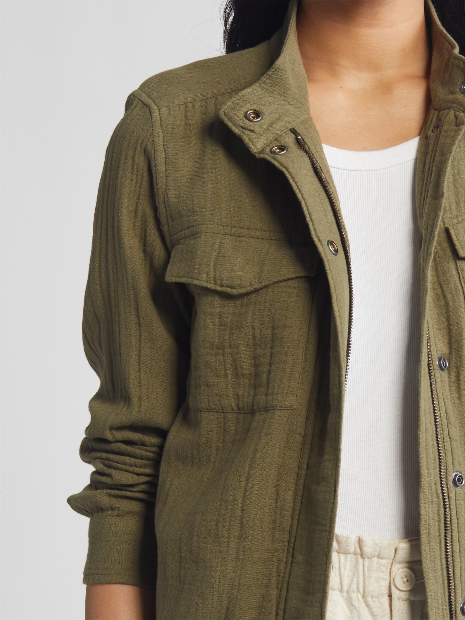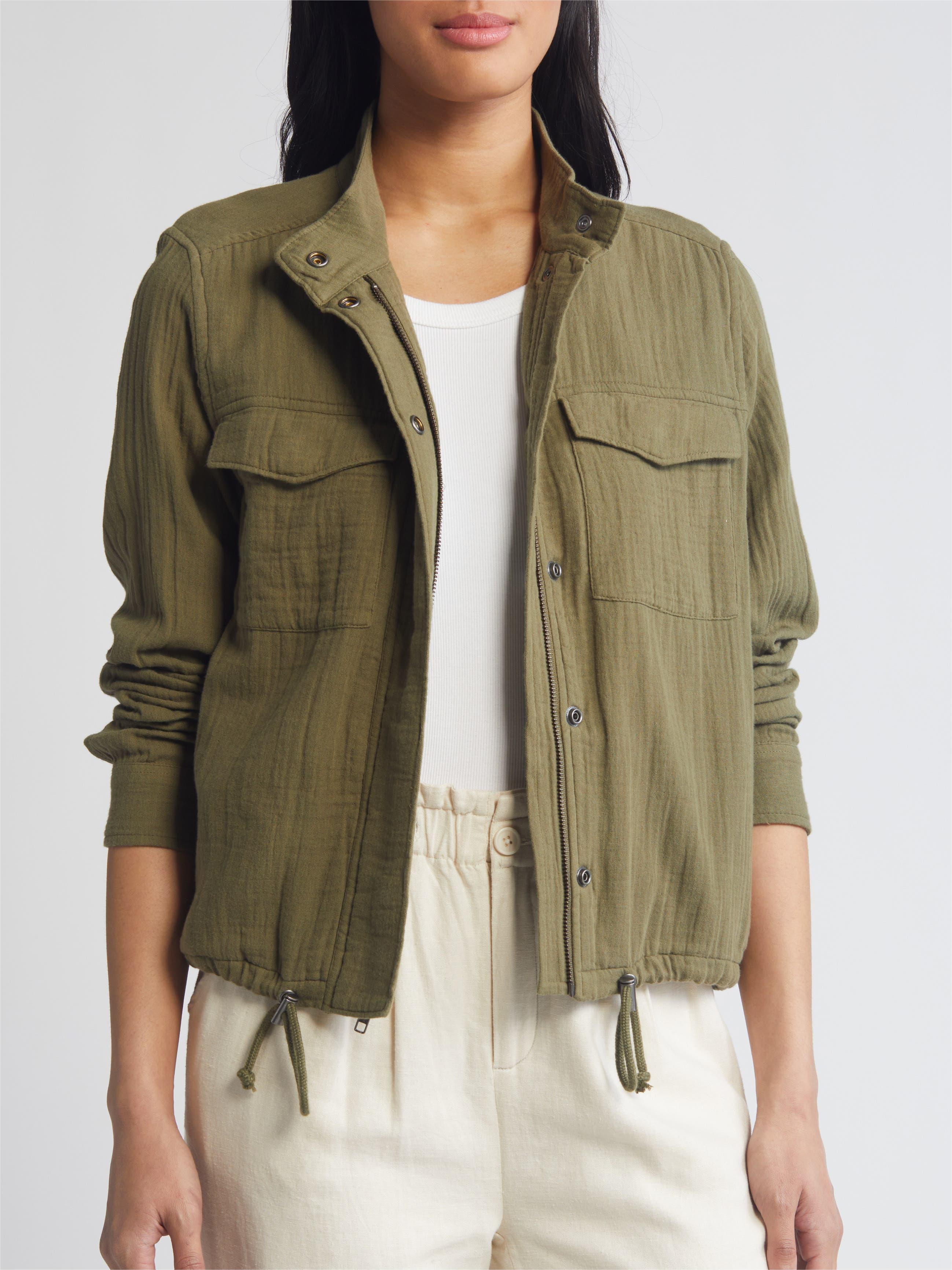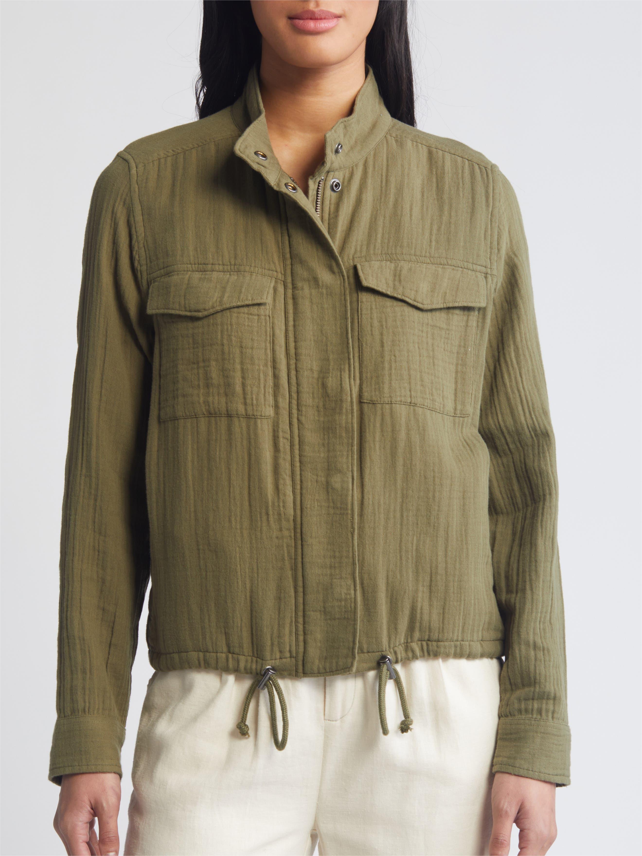 Work the weekend in a trend-right utility jacket cut from soft cotton gauze.