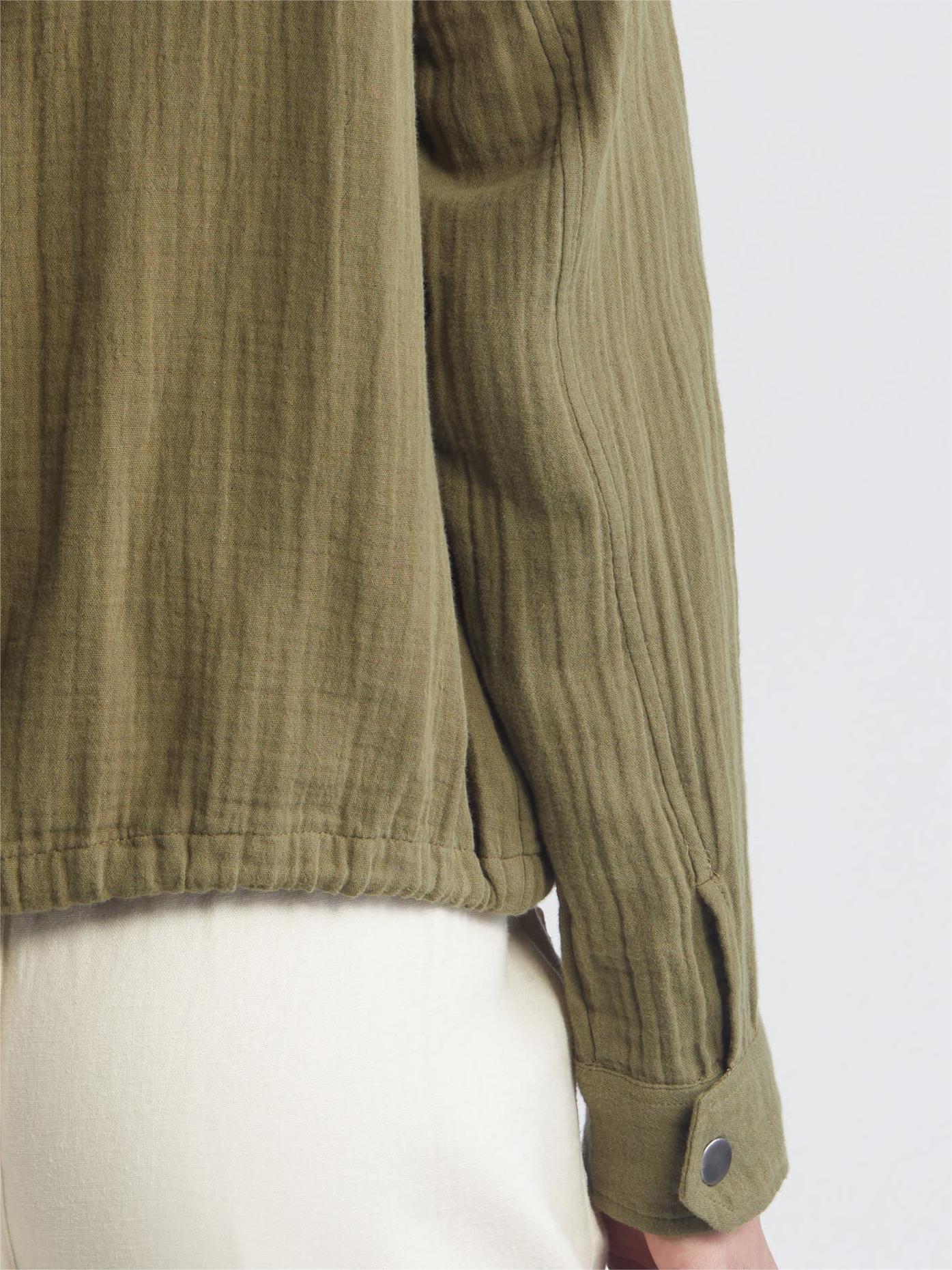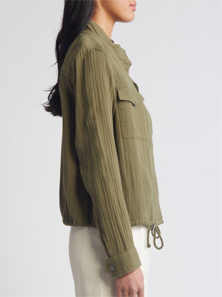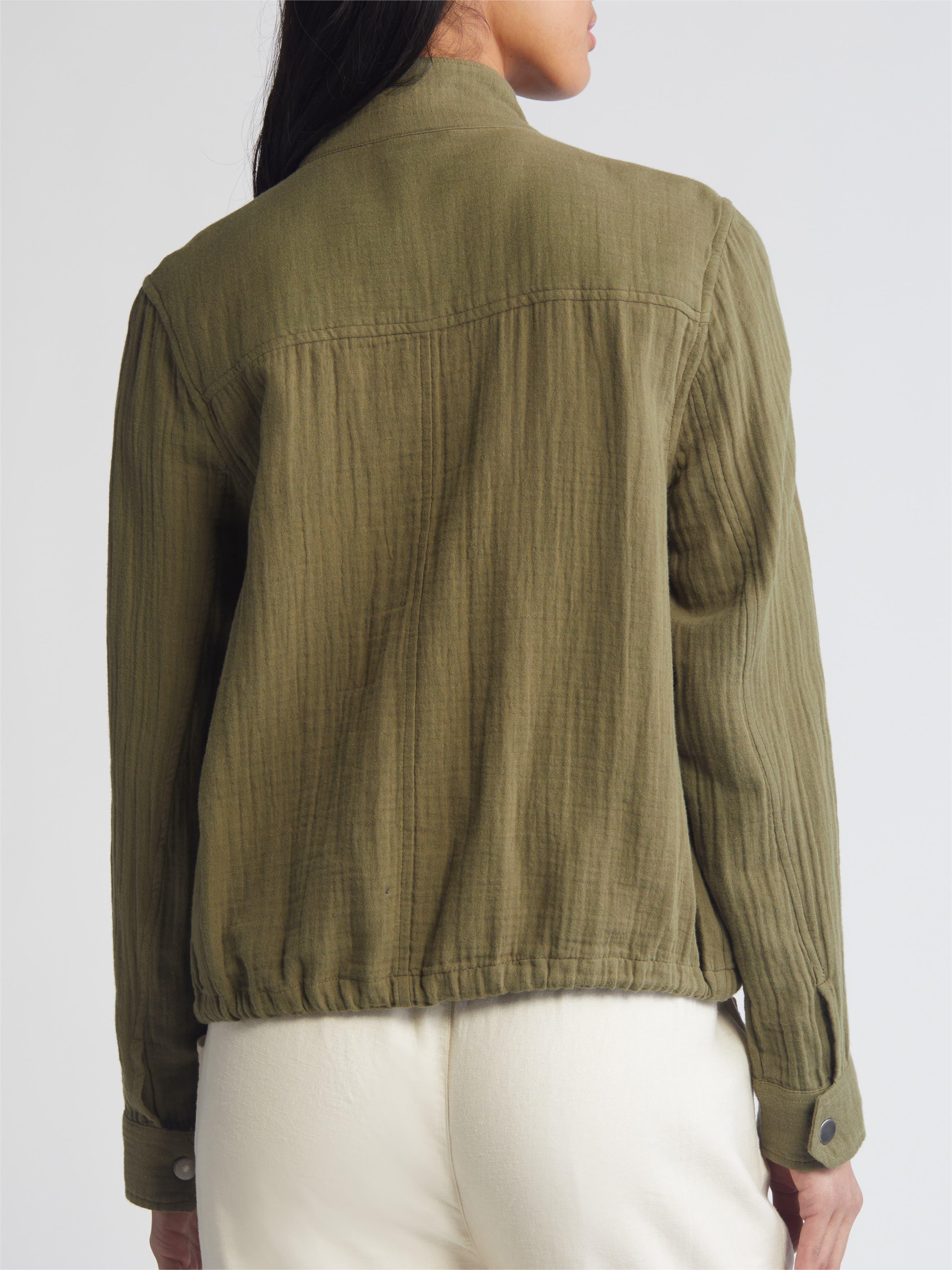 Work the weekend in a trend-right utility jacket cut from soft cotton gauze.