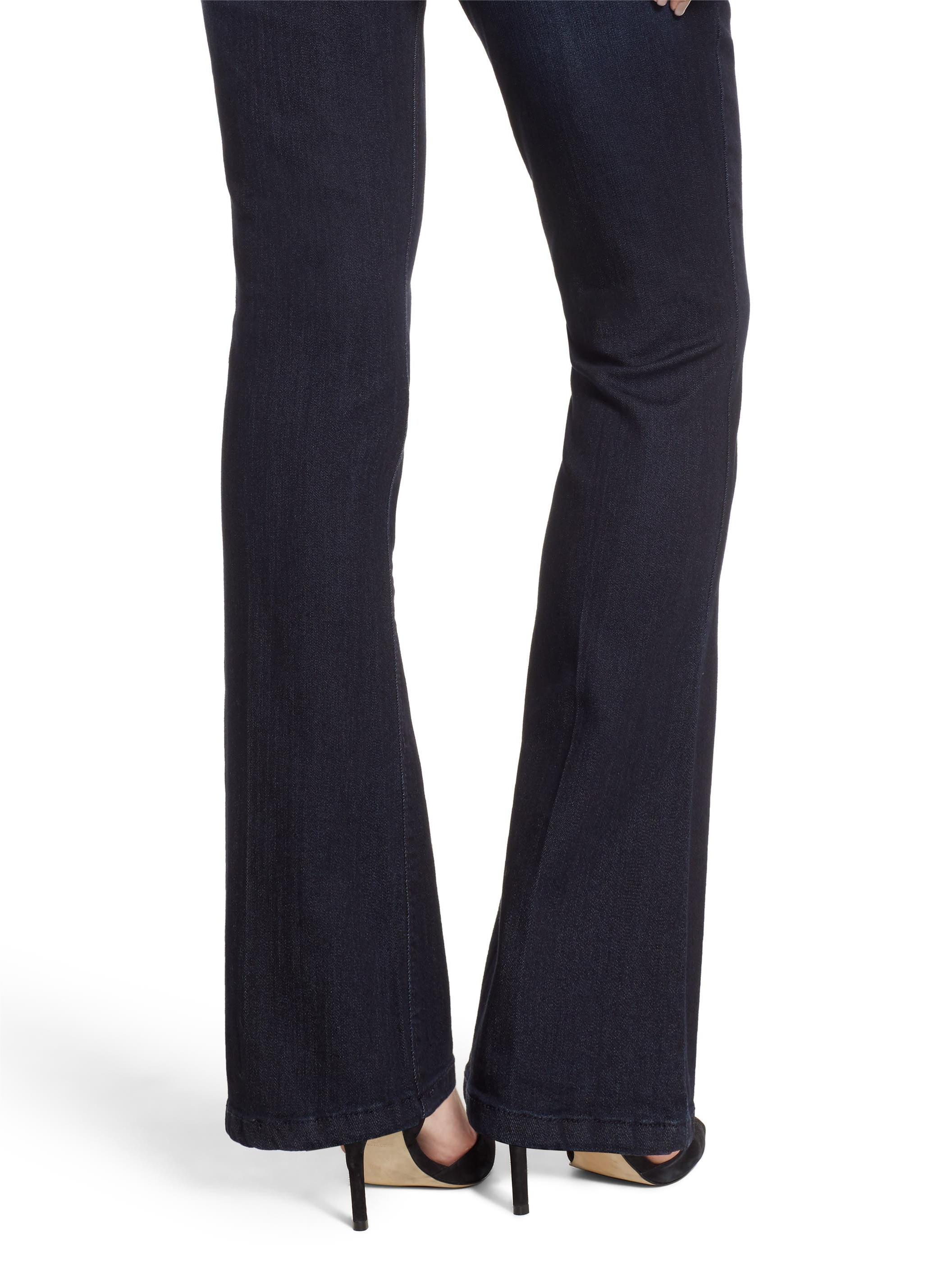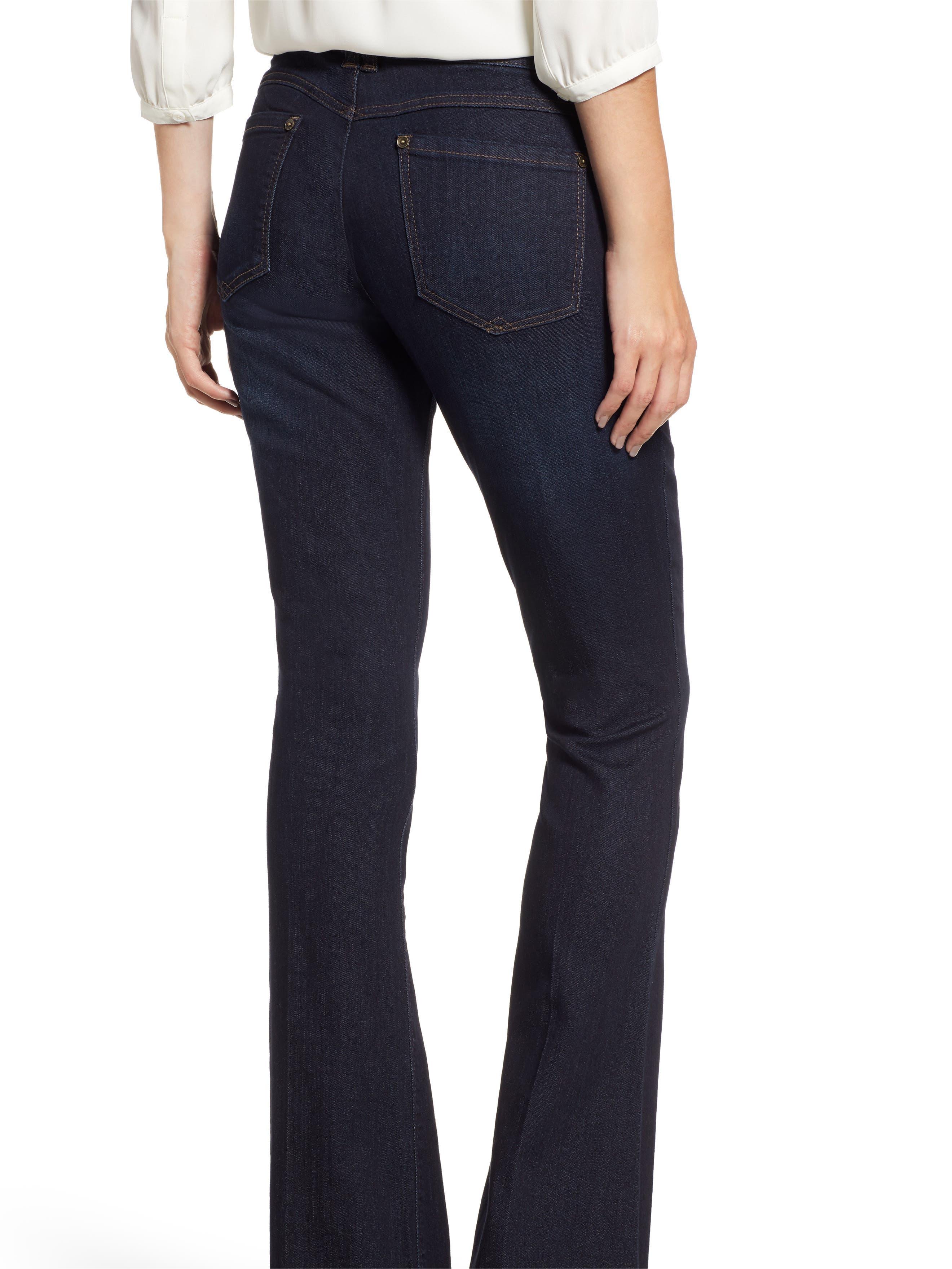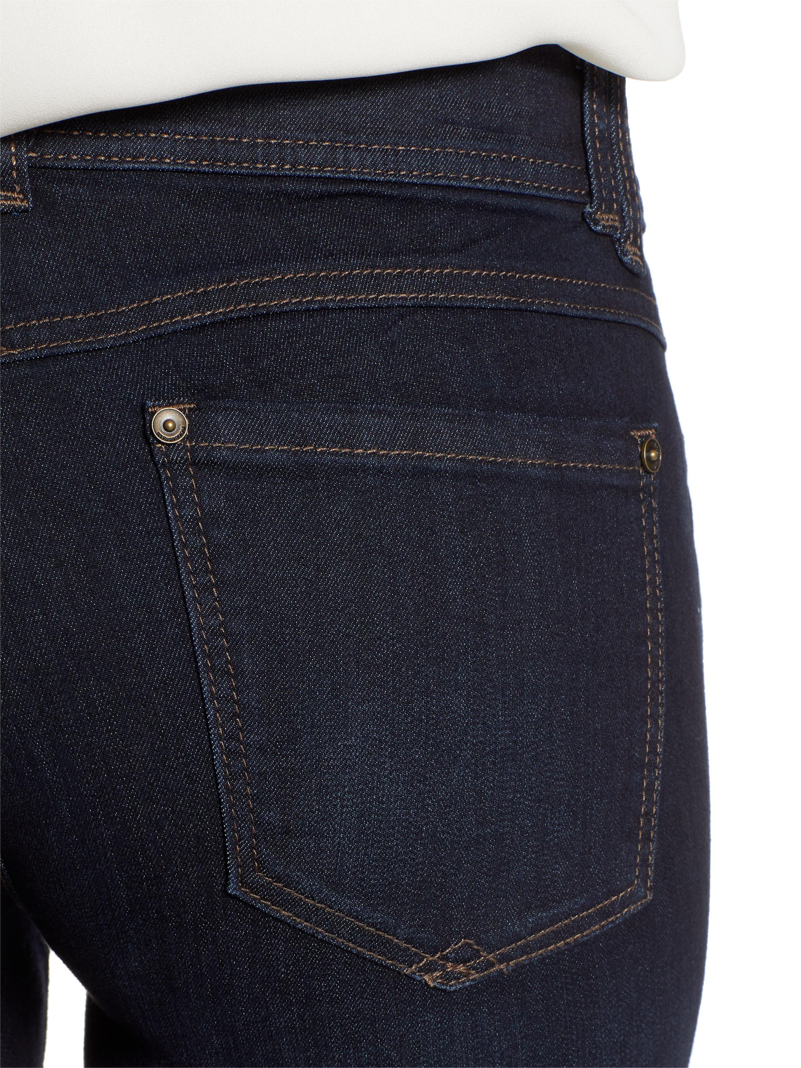 Stretch jeans in a polished dark wash get a lean and leggy look from a slim cut balanced with a narrow boot-leg opening.