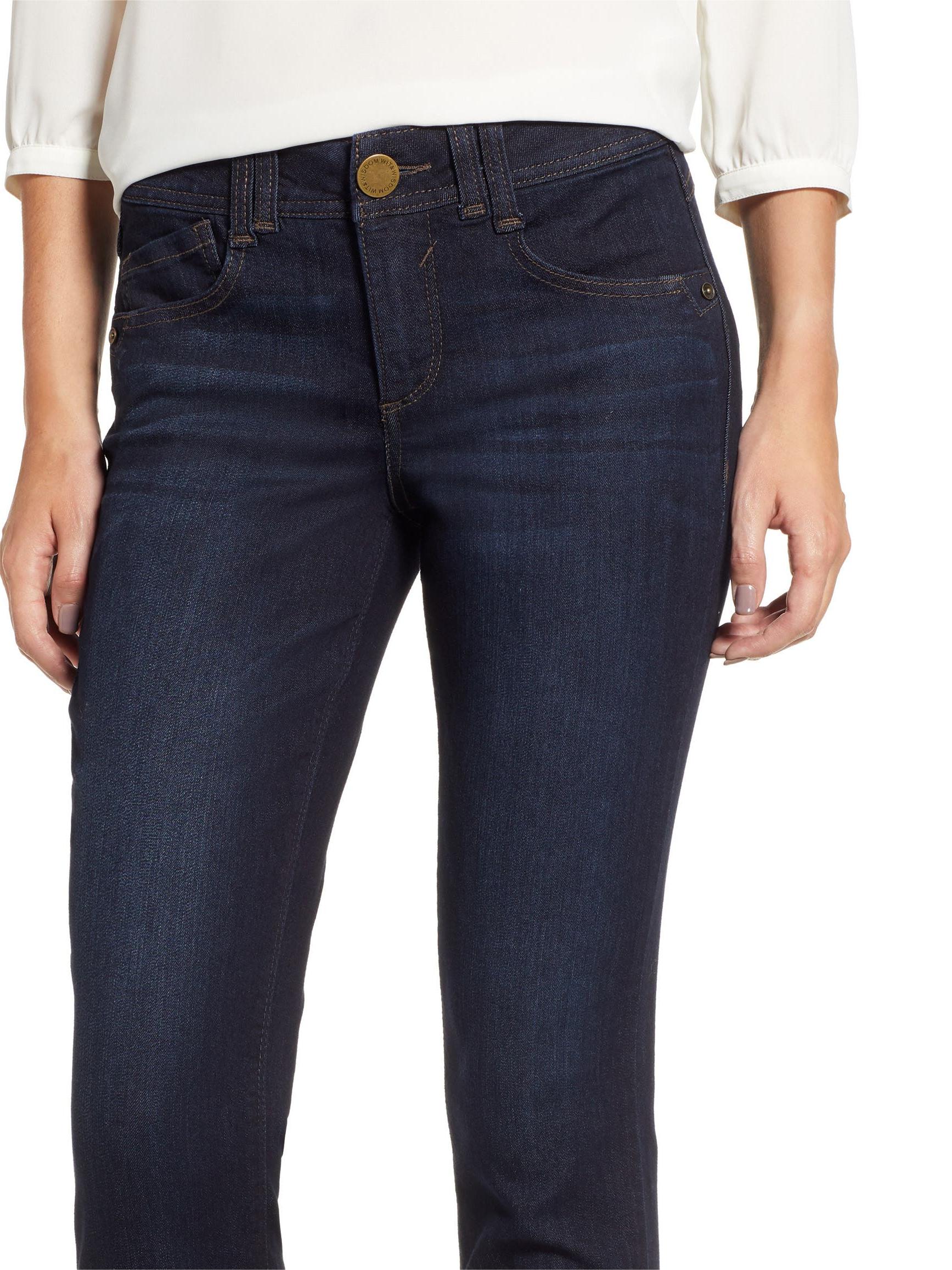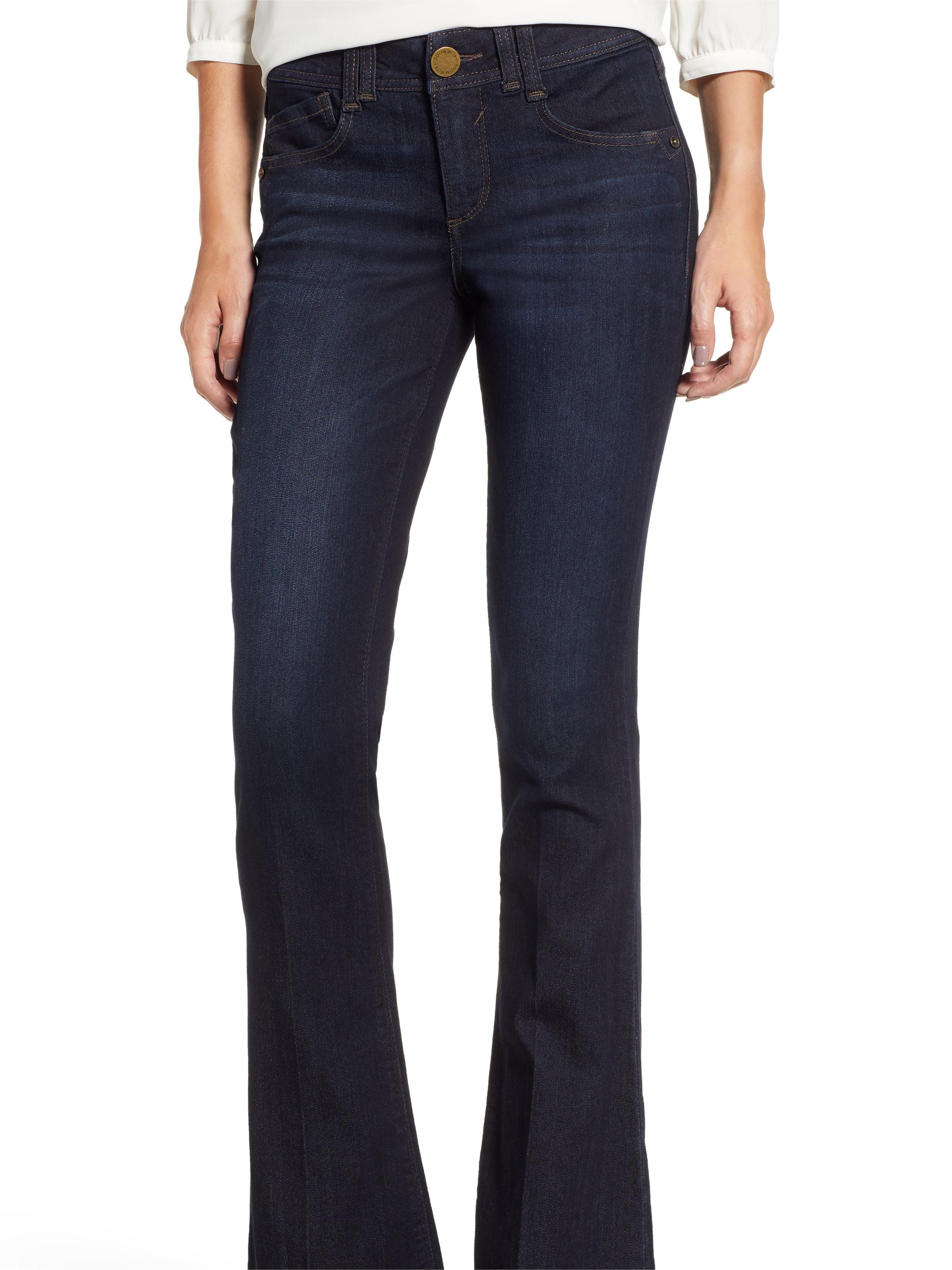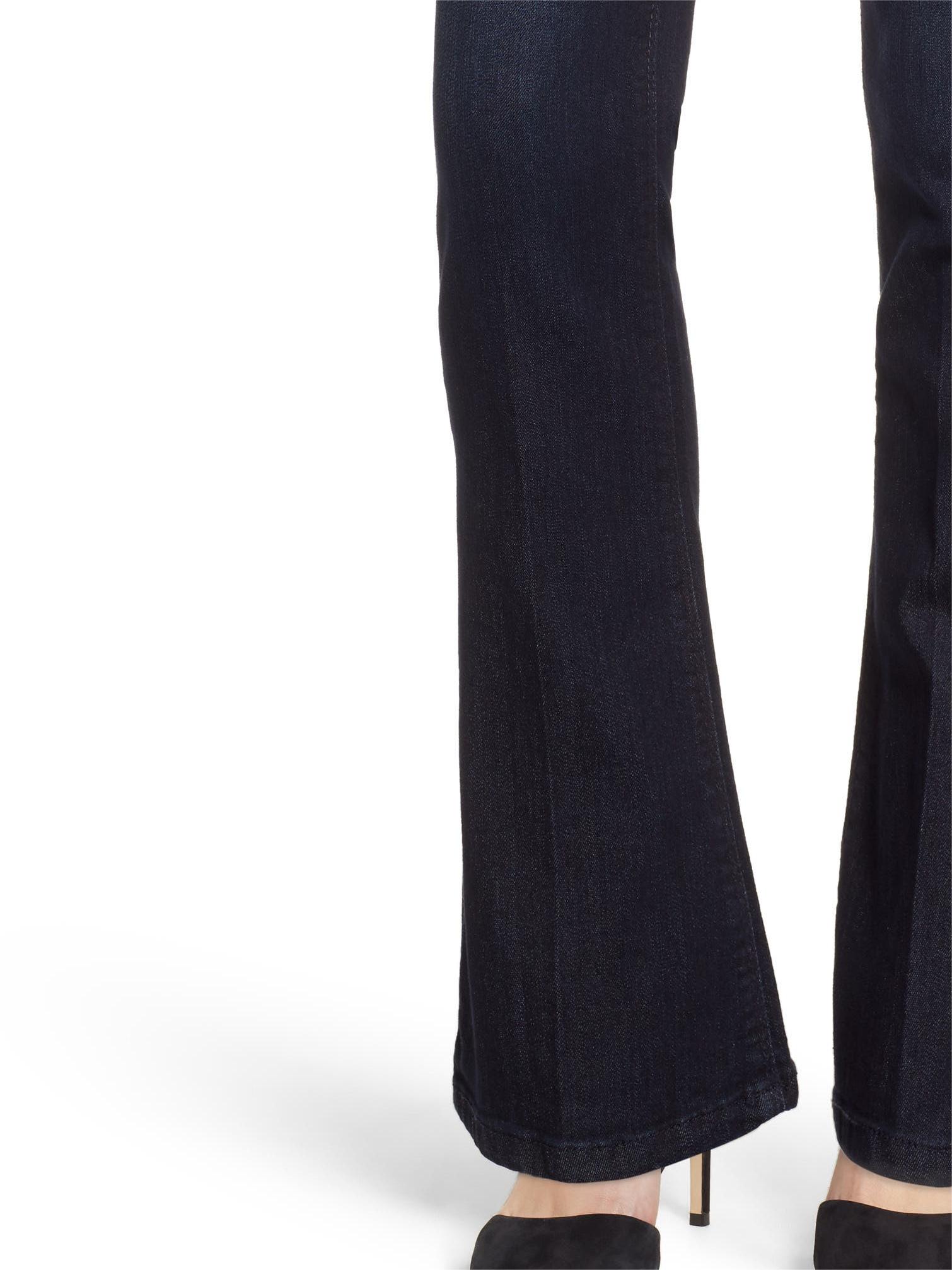 Stretch jeans in a polished dark wash get a lean and leggy look from a slim cut balanced with a narrow boot-leg opening.