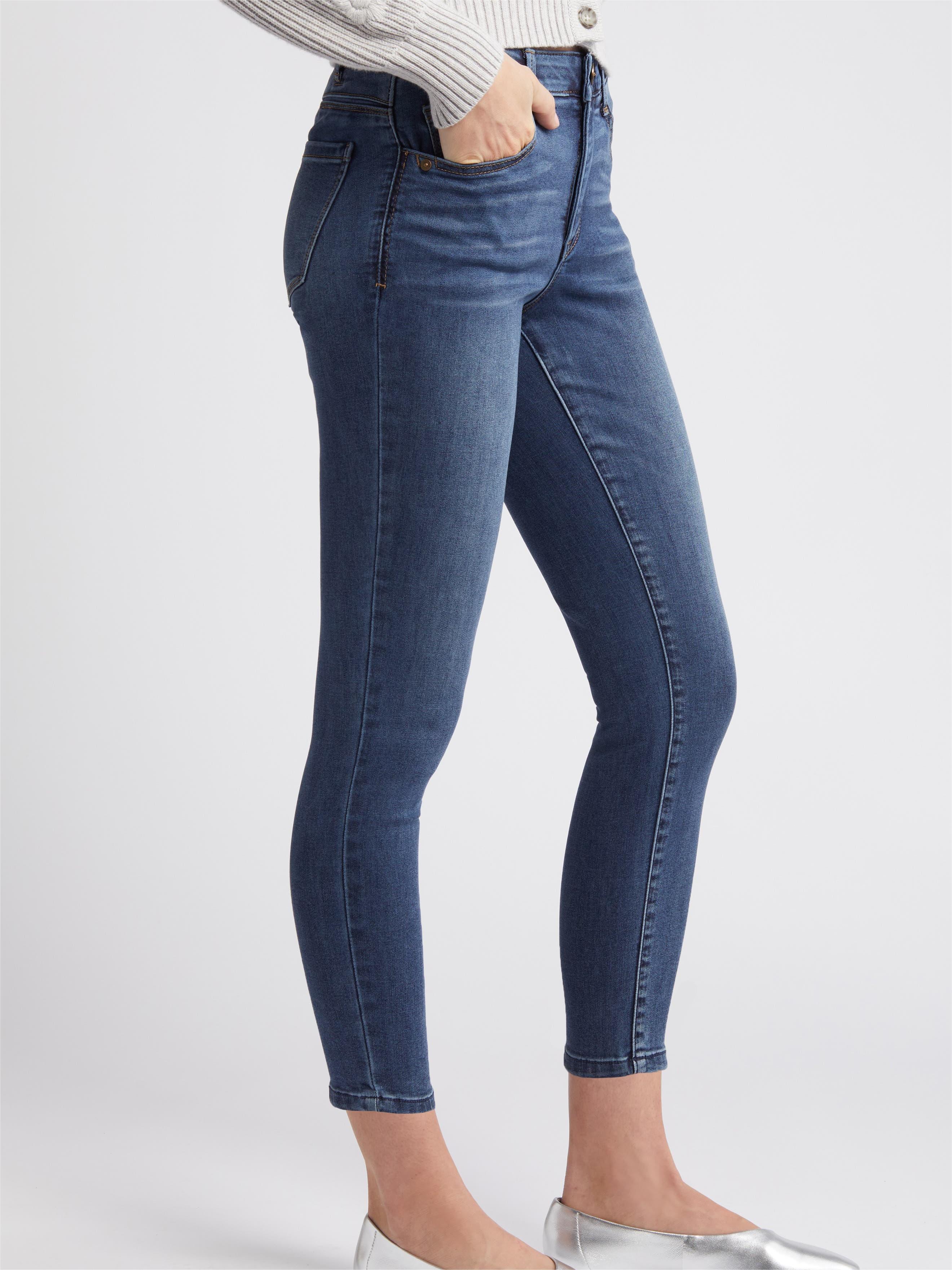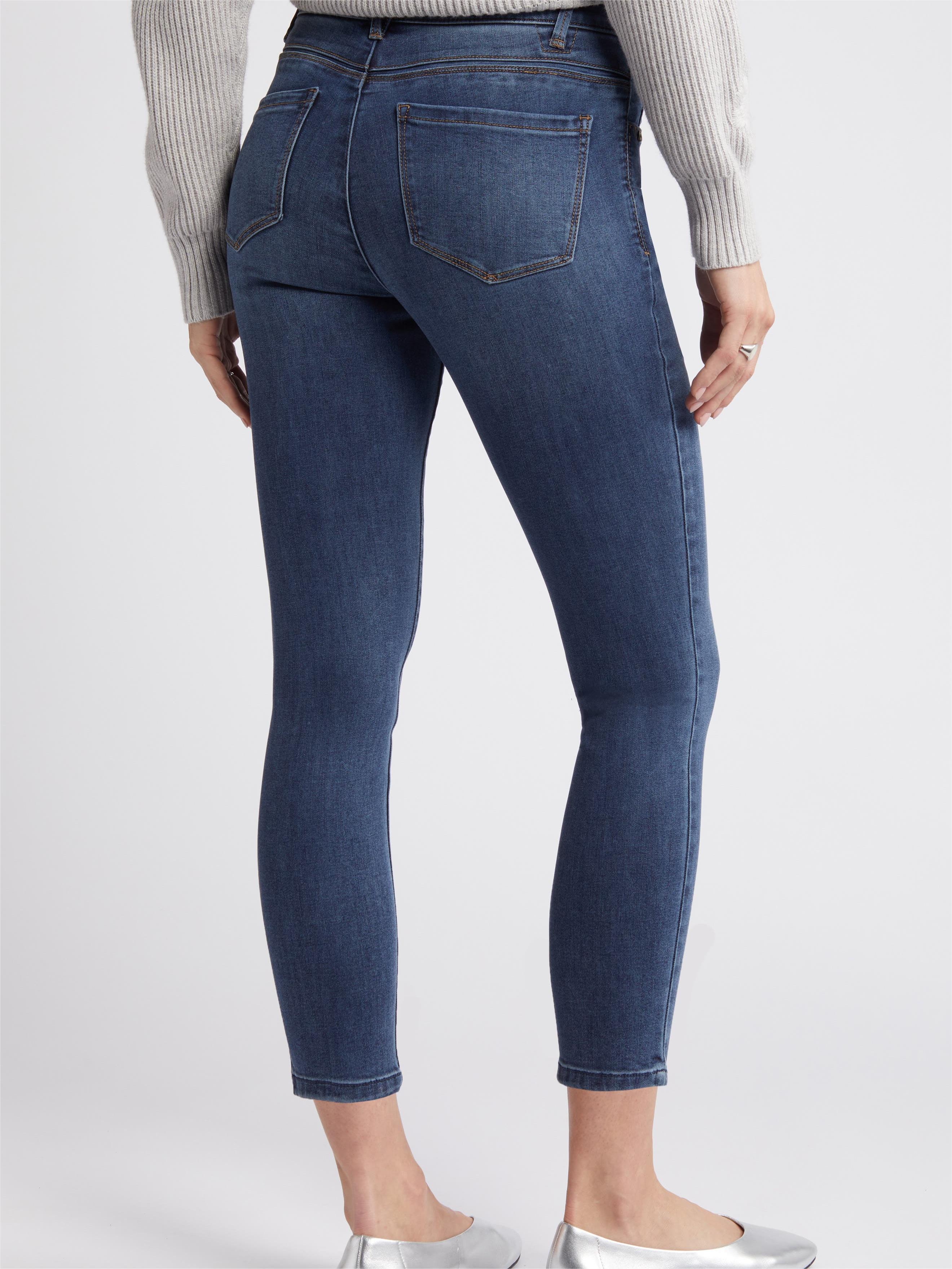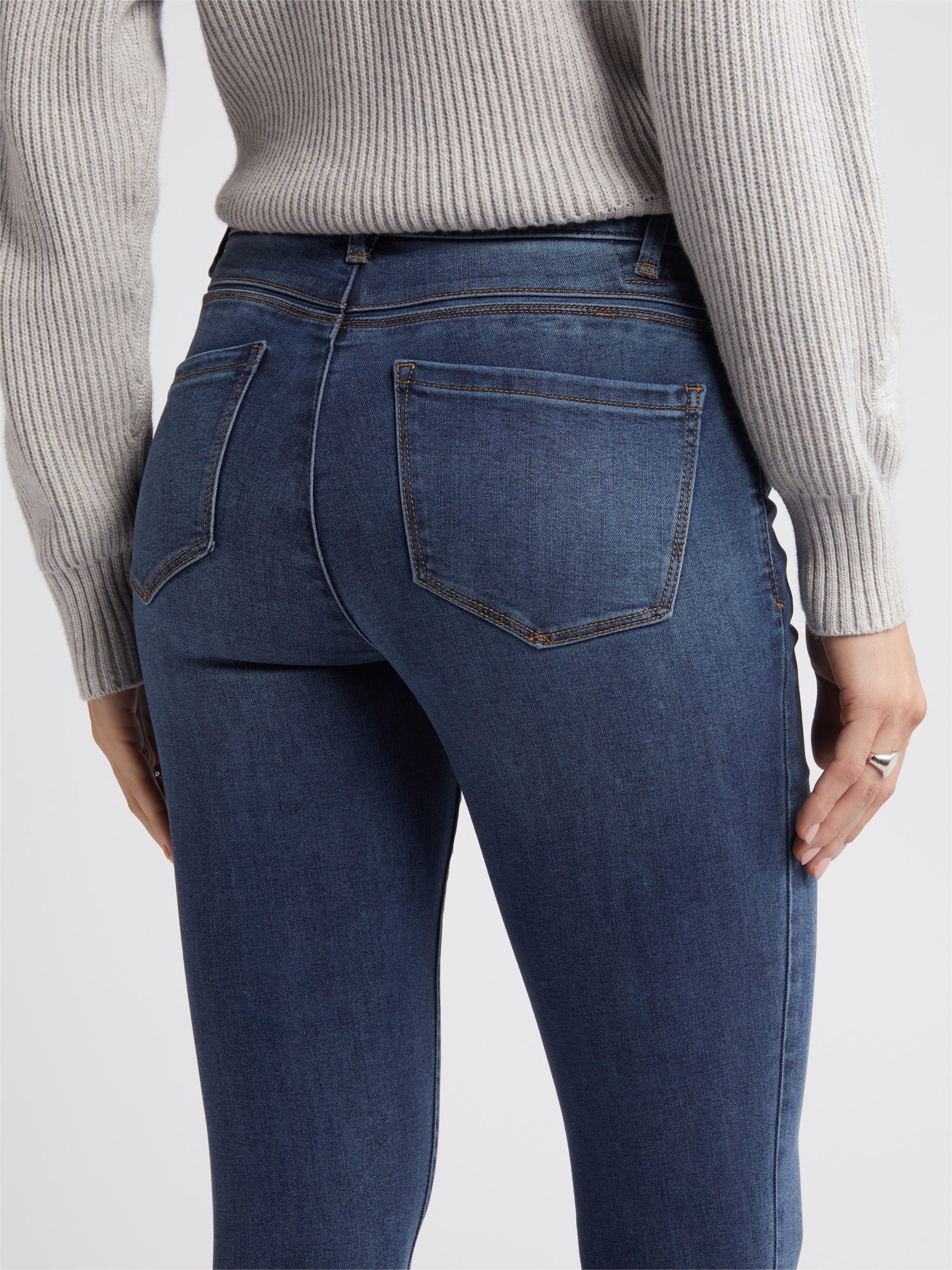 A dark indigo wash enhances the leggy look of these curve-skimming jeans with just a bit of whiskering to give them the look of well-loved faves.