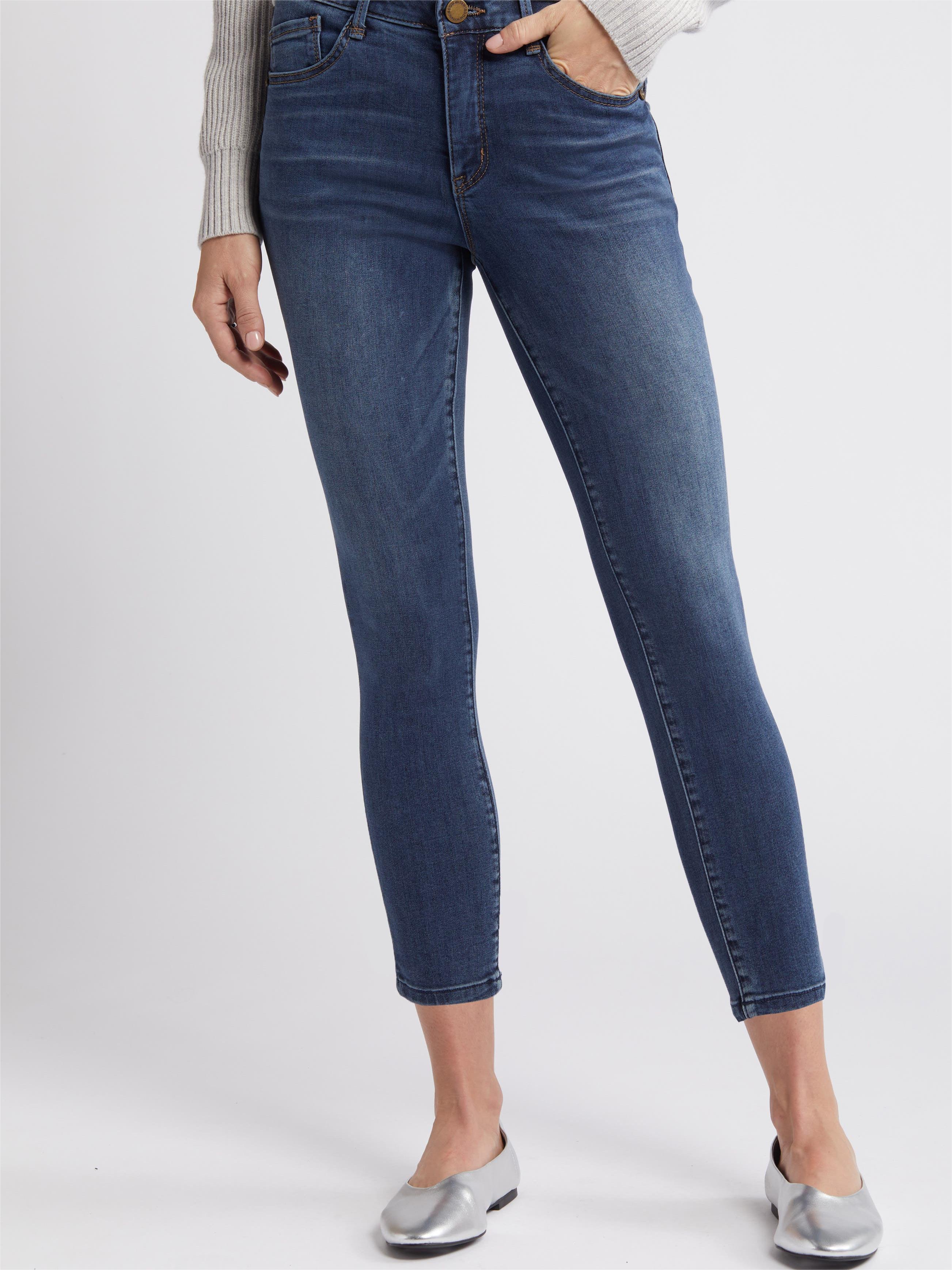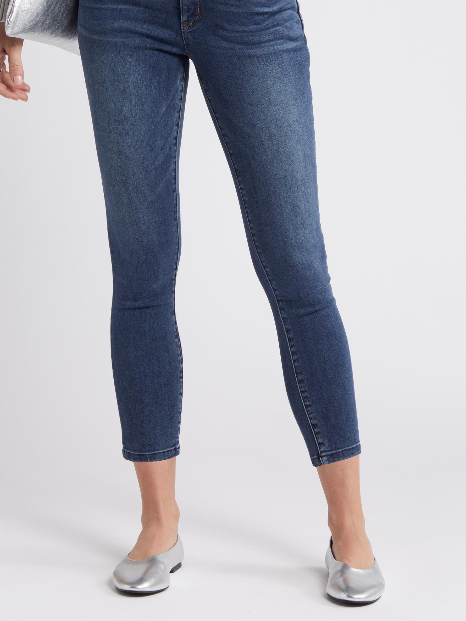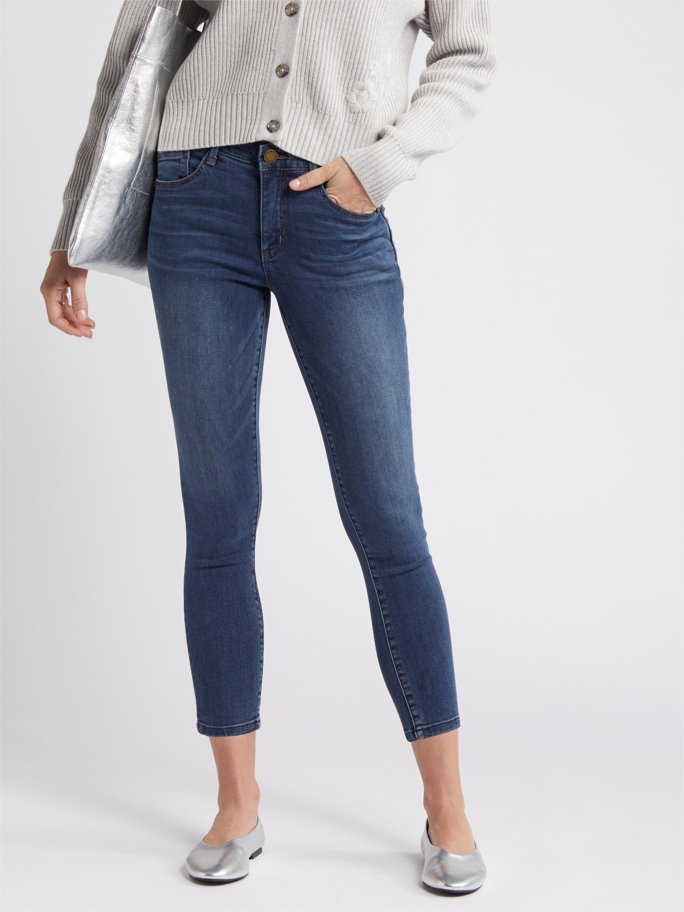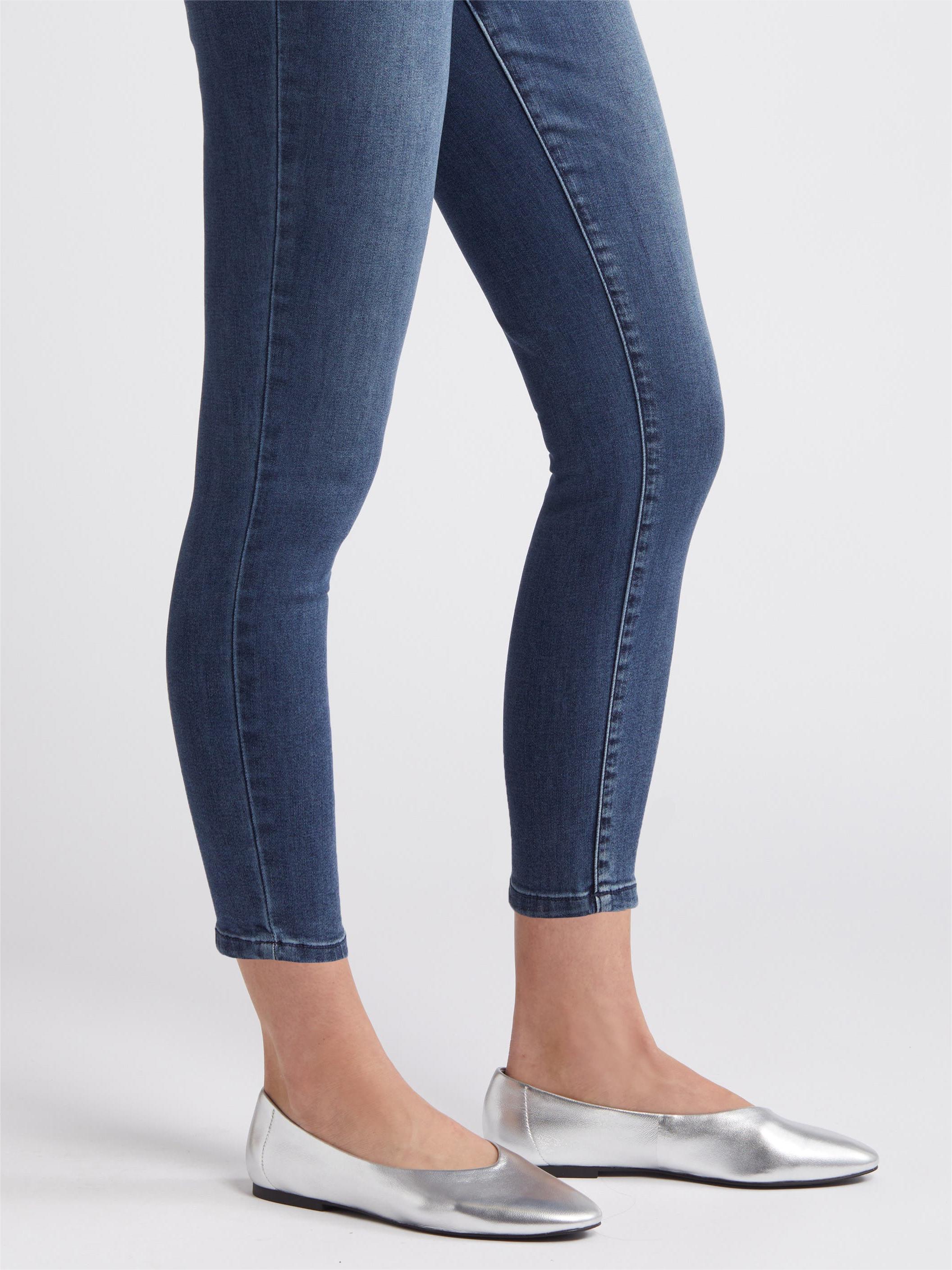 A dark indigo wash enhances the leggy look of these curve-skimming jeans with just a bit of whiskering to give them the look of well-loved faves.