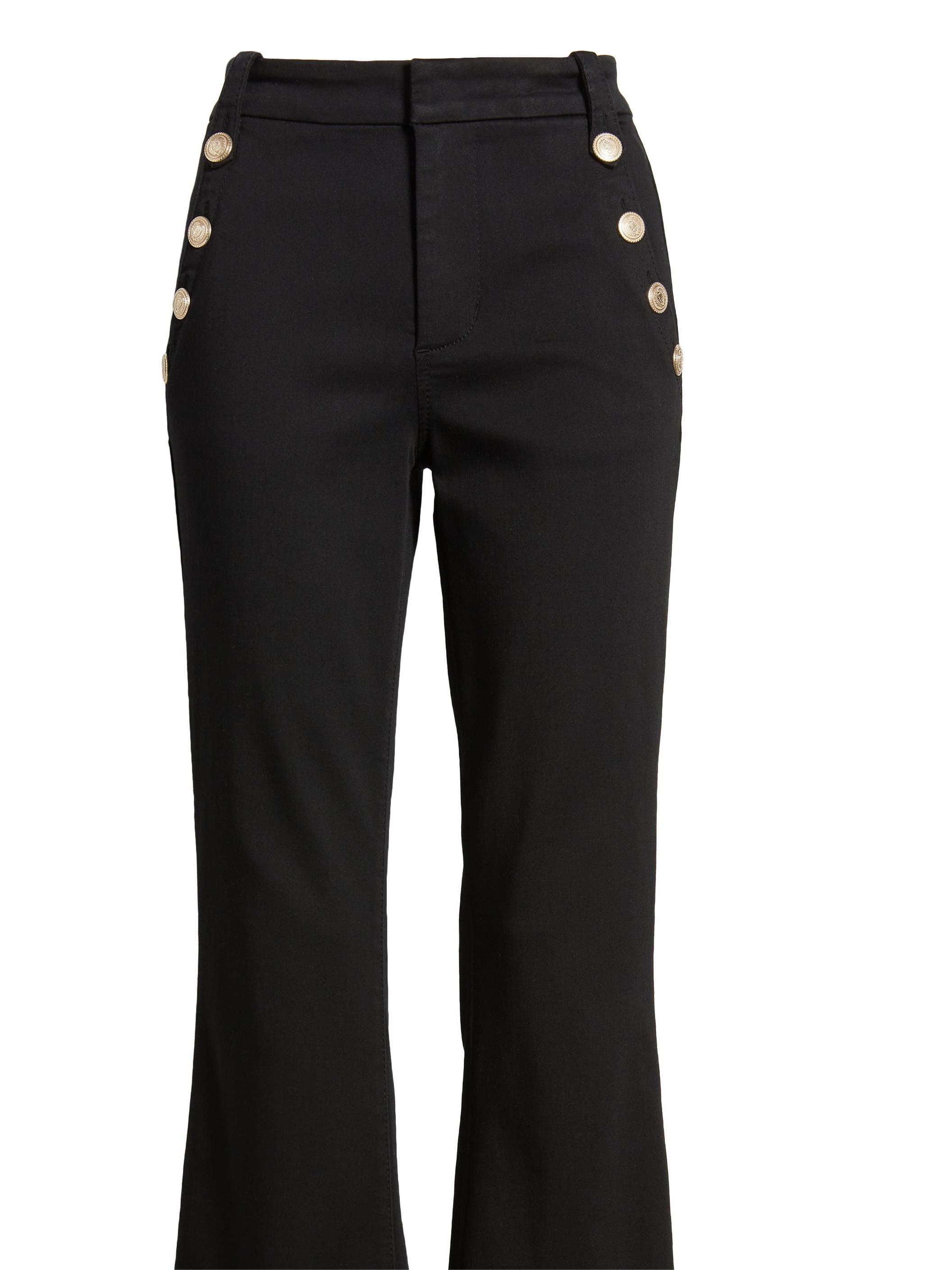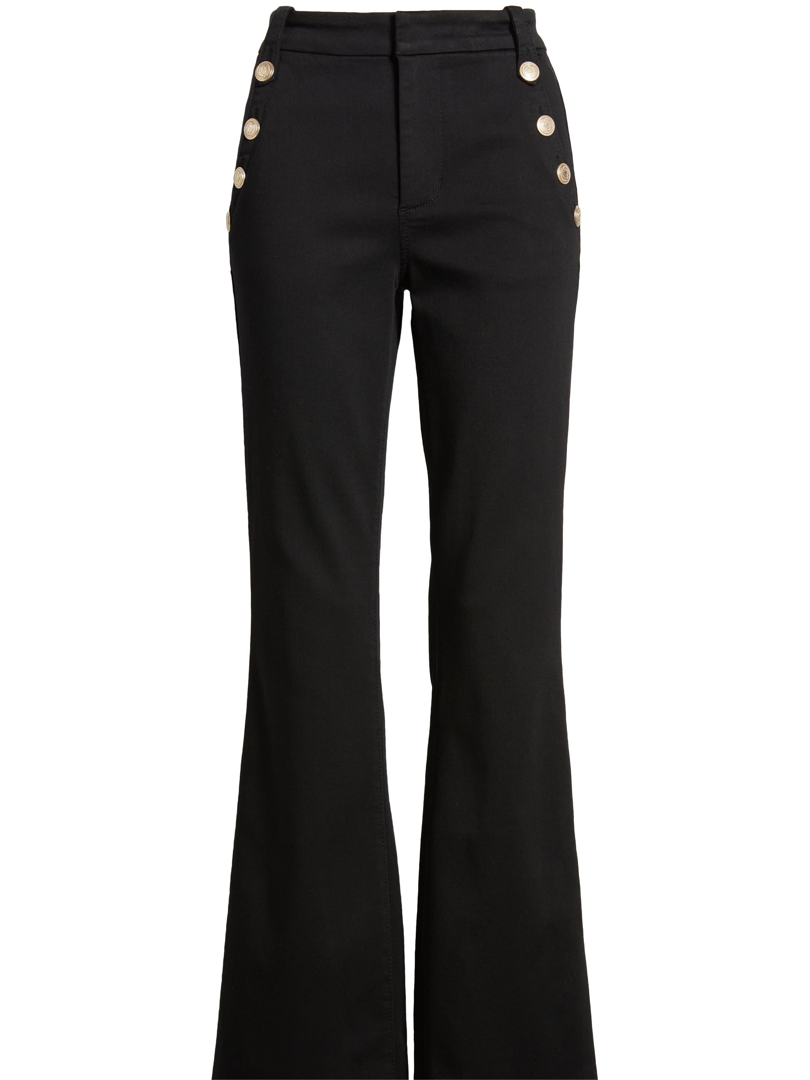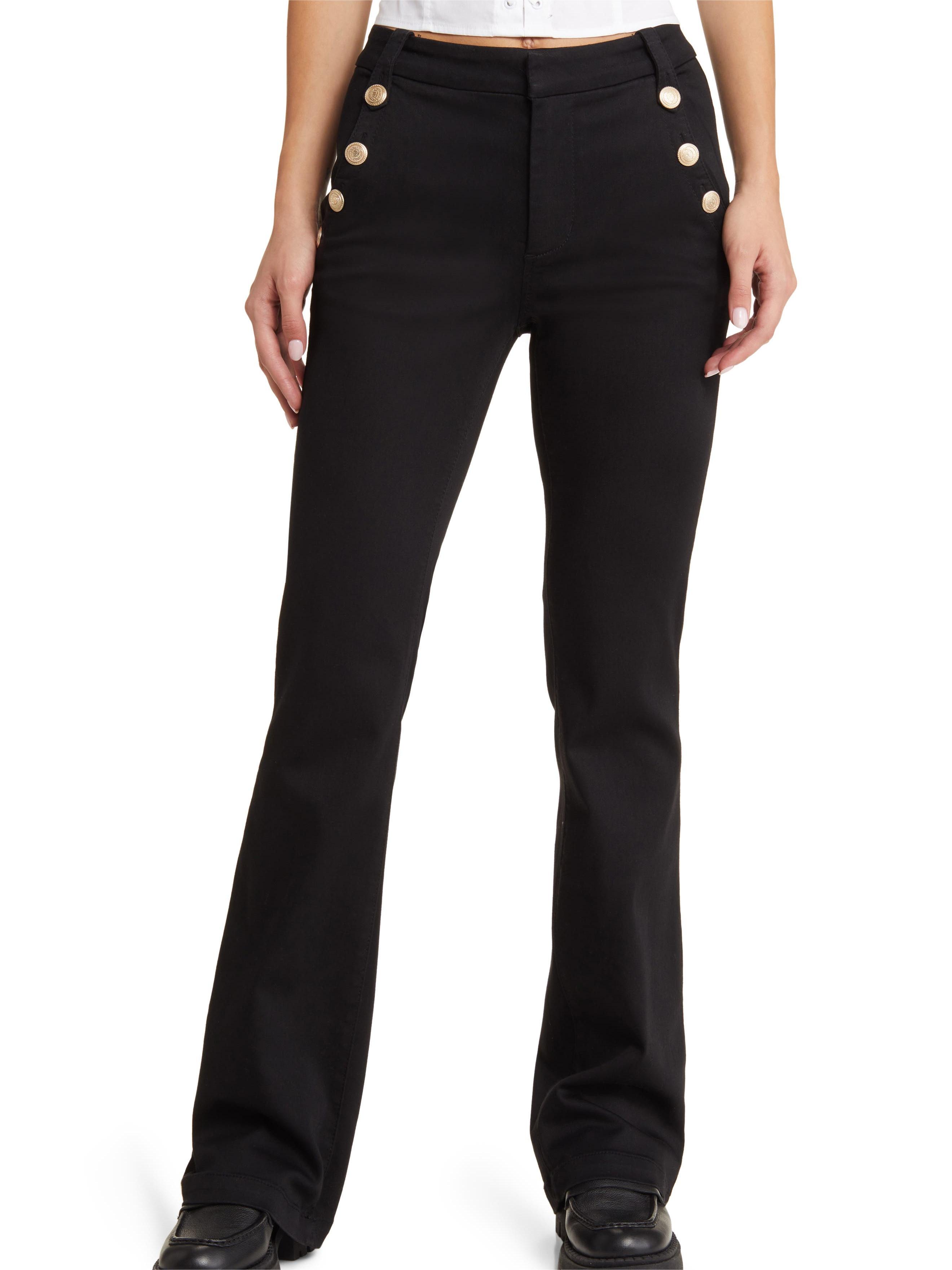 Add nautical style to your look with these stretchy, full-length bootcut jeans popped with gleaming sailor buttons at the front pockets.