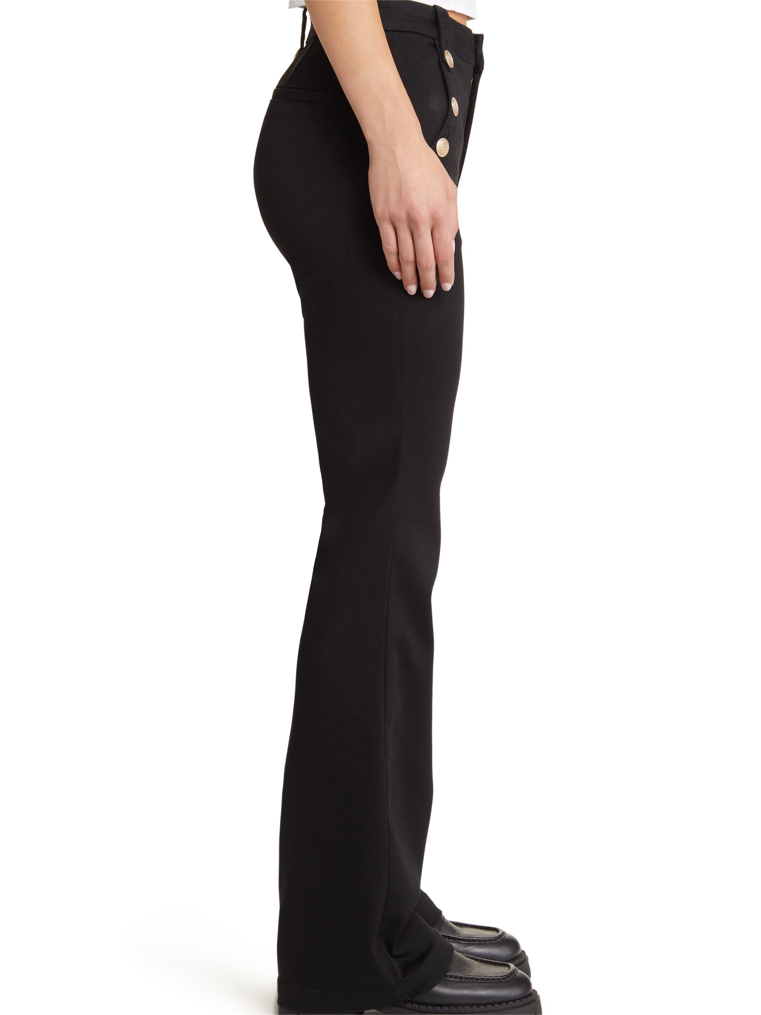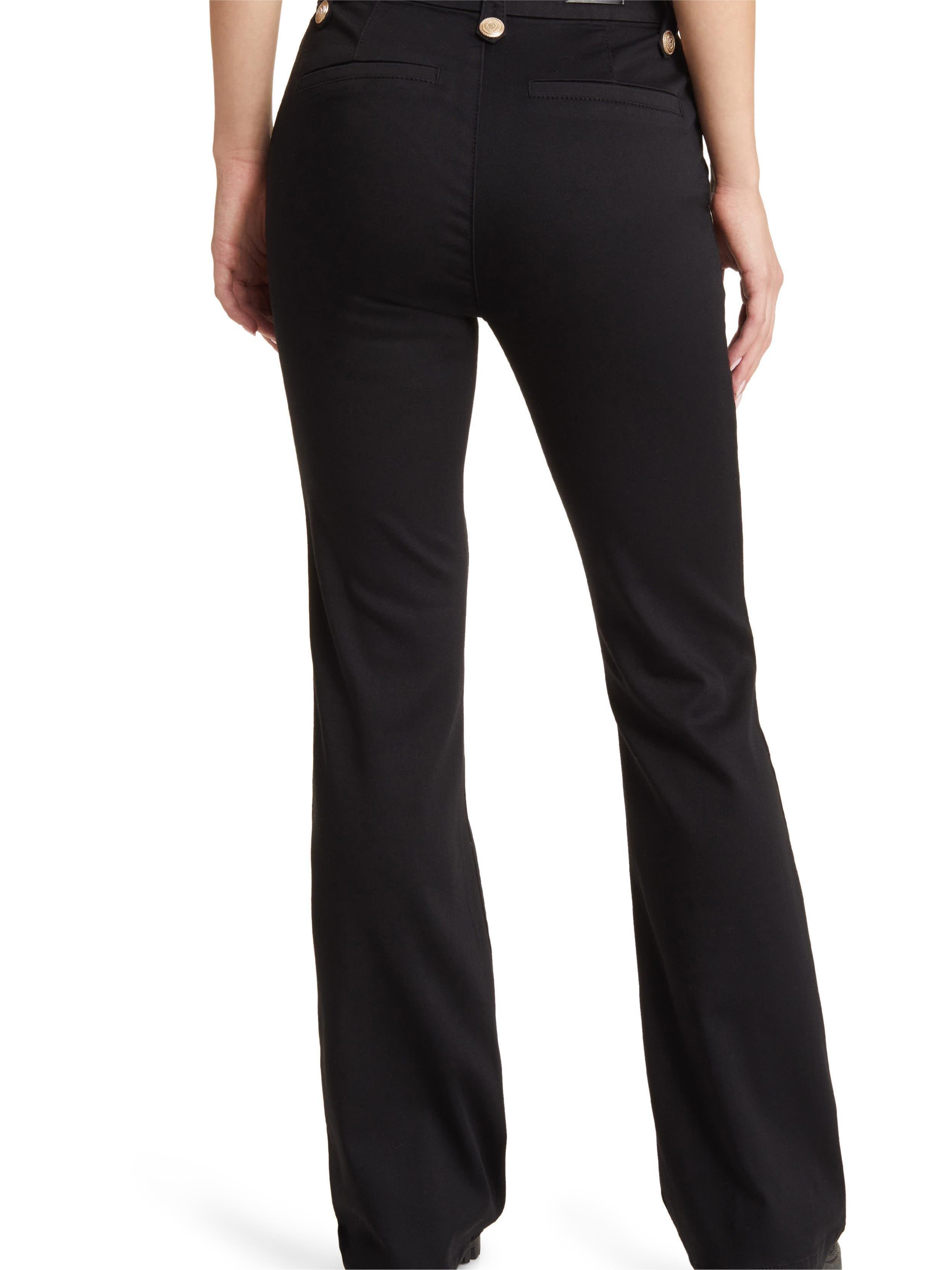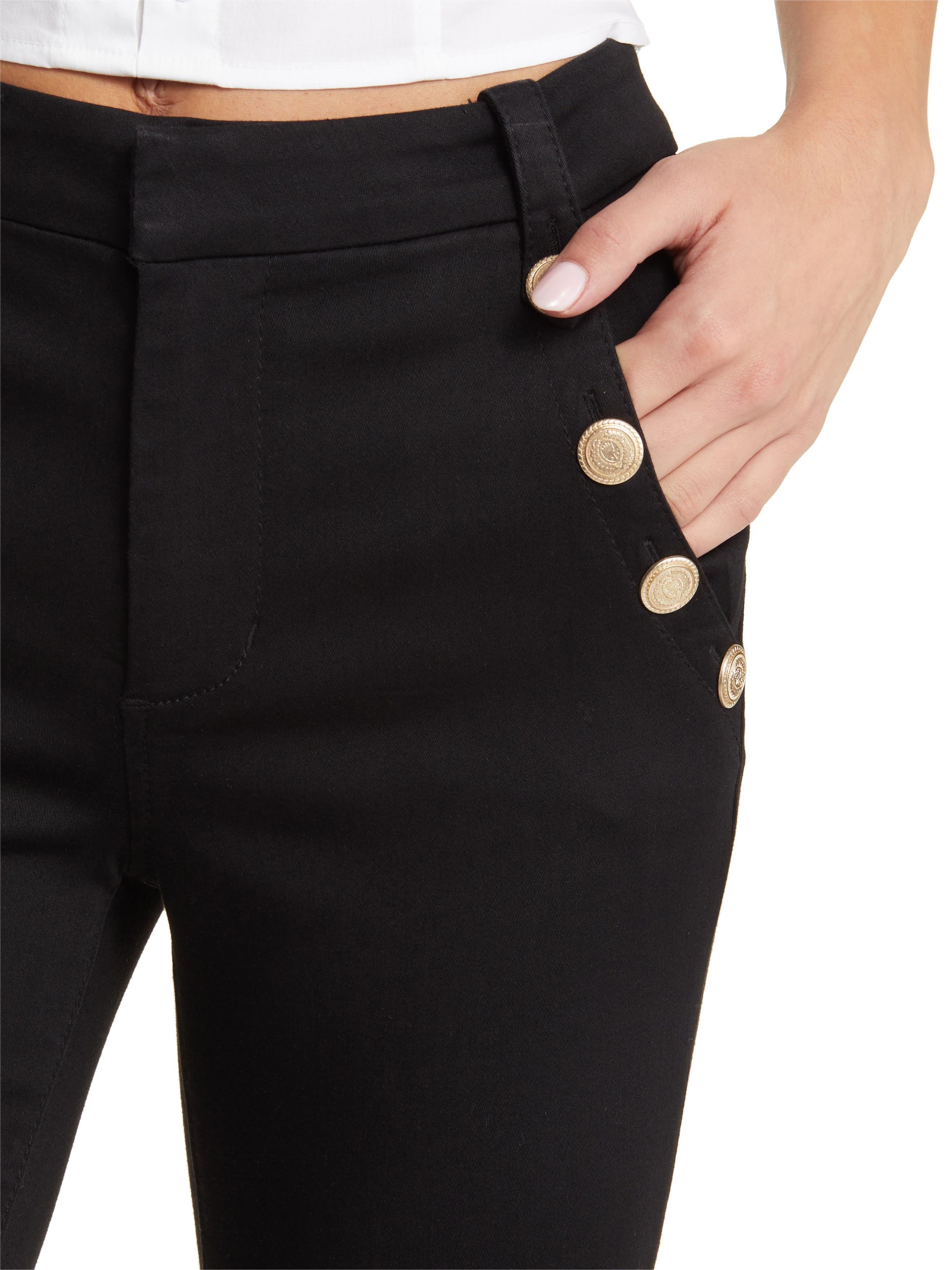 Add nautical style to your look with these stretchy, full-length bootcut jeans popped with gleaming sailor buttons at the front pockets.