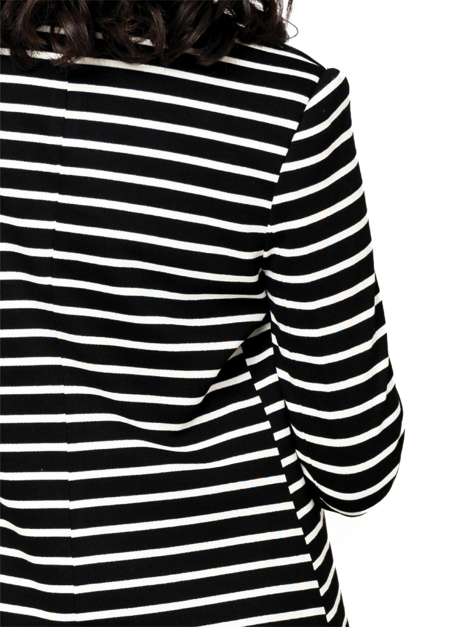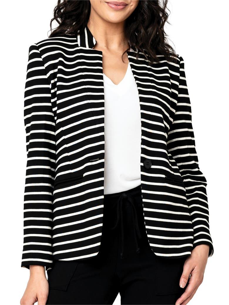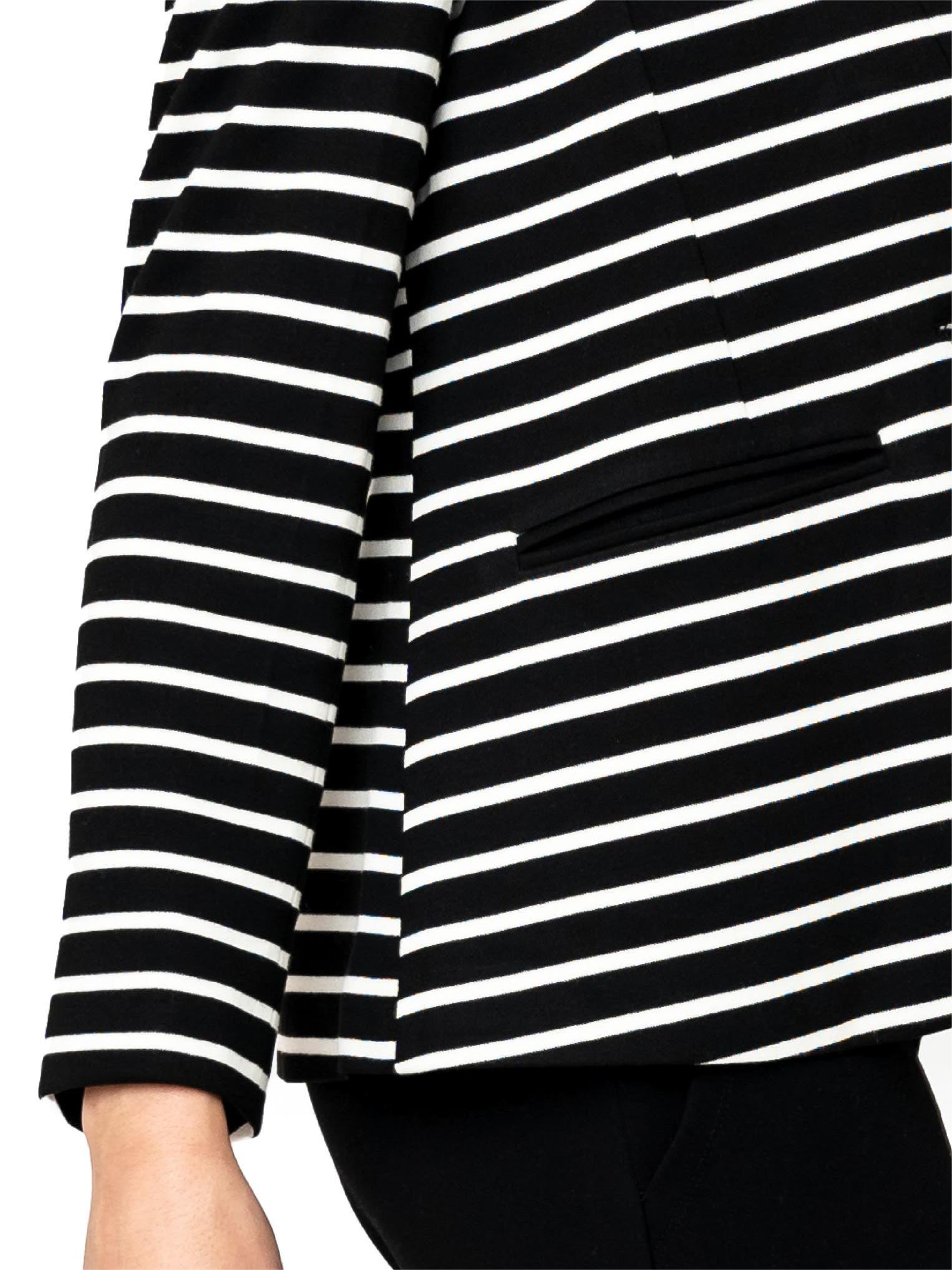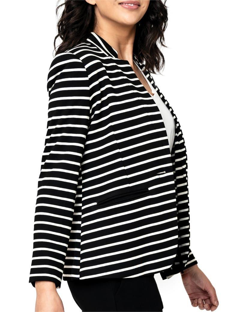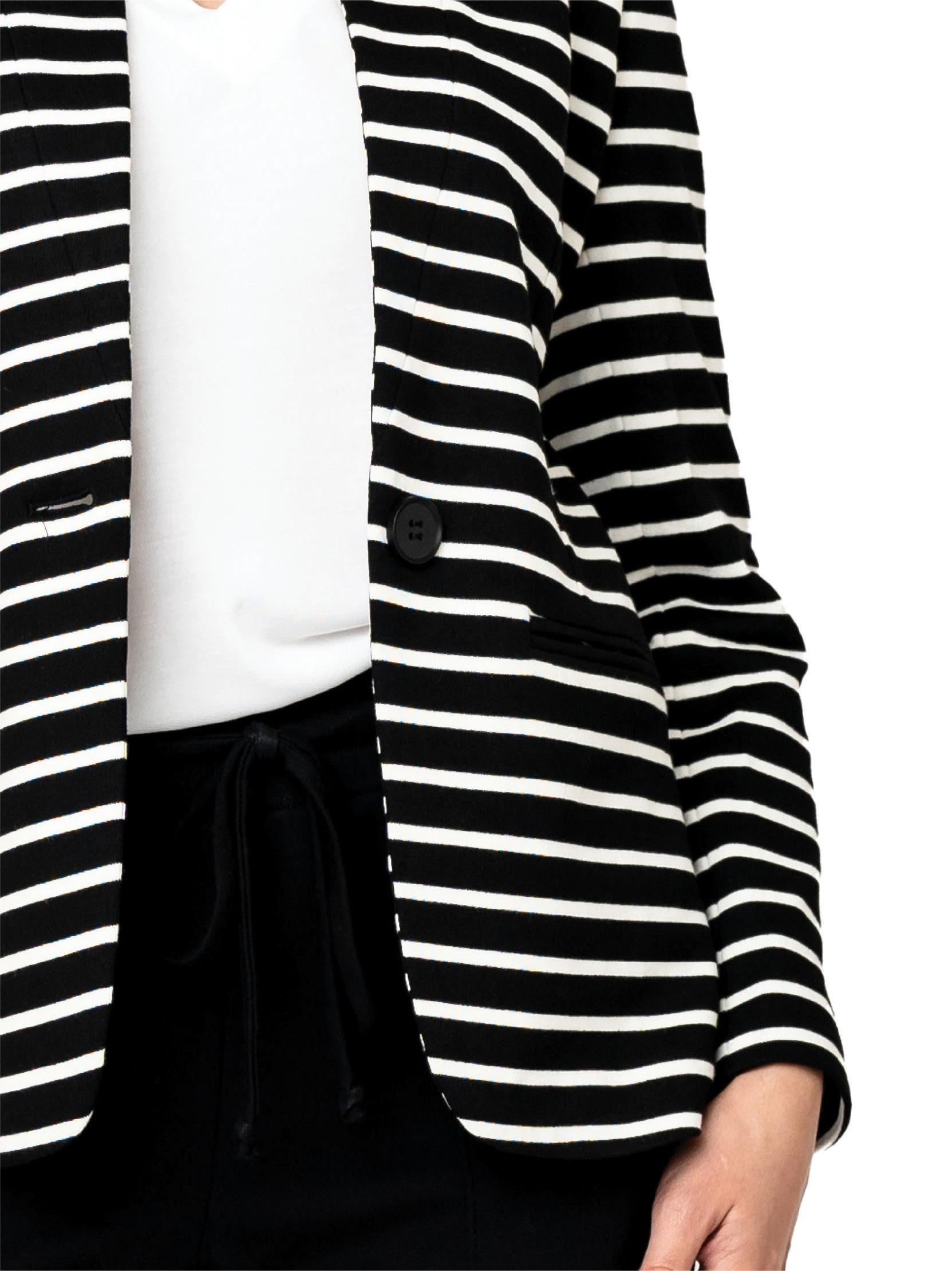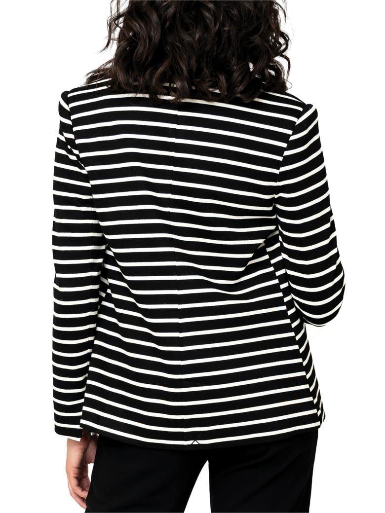 Move with ease in this polished knit blazer covered in lively stripes for day-to-night versatility.