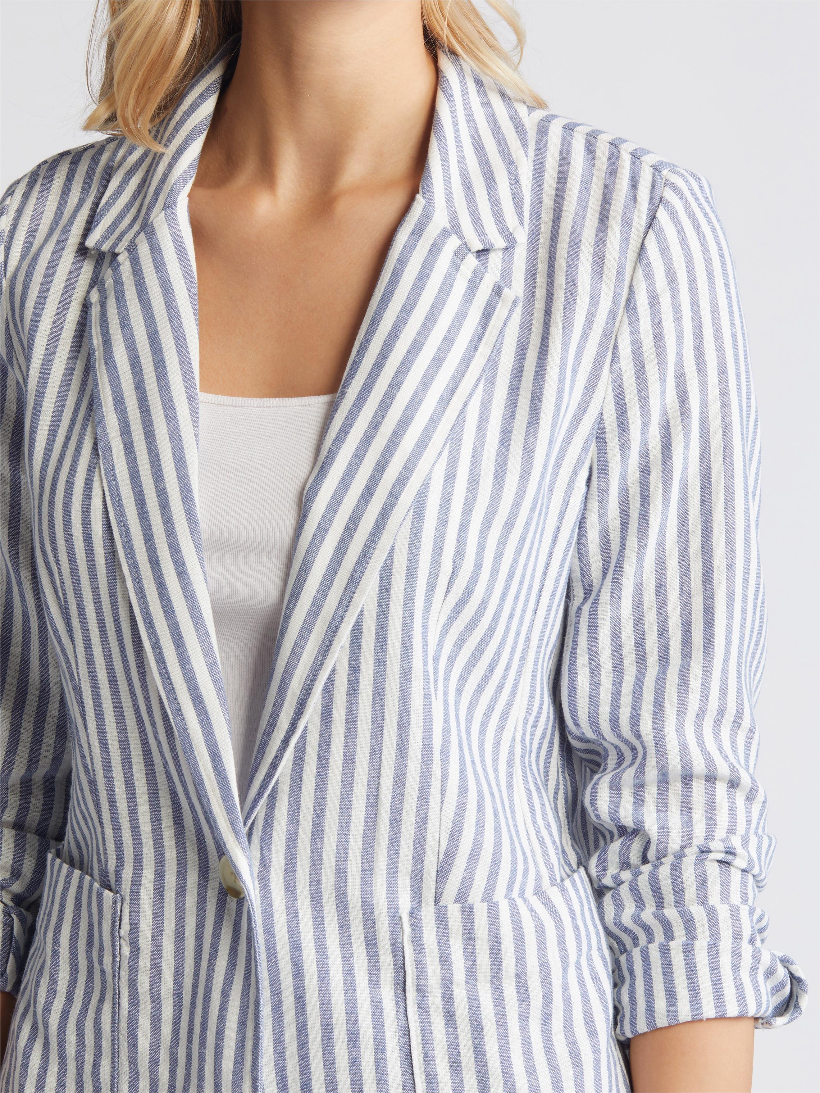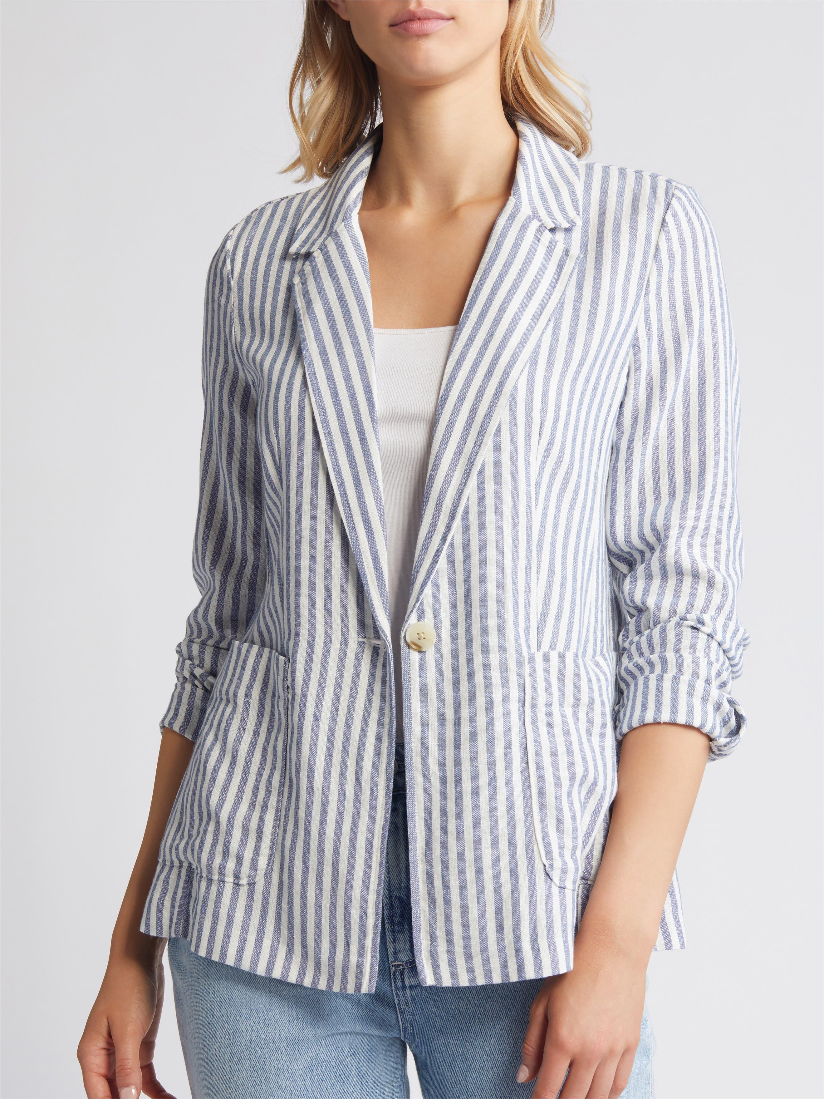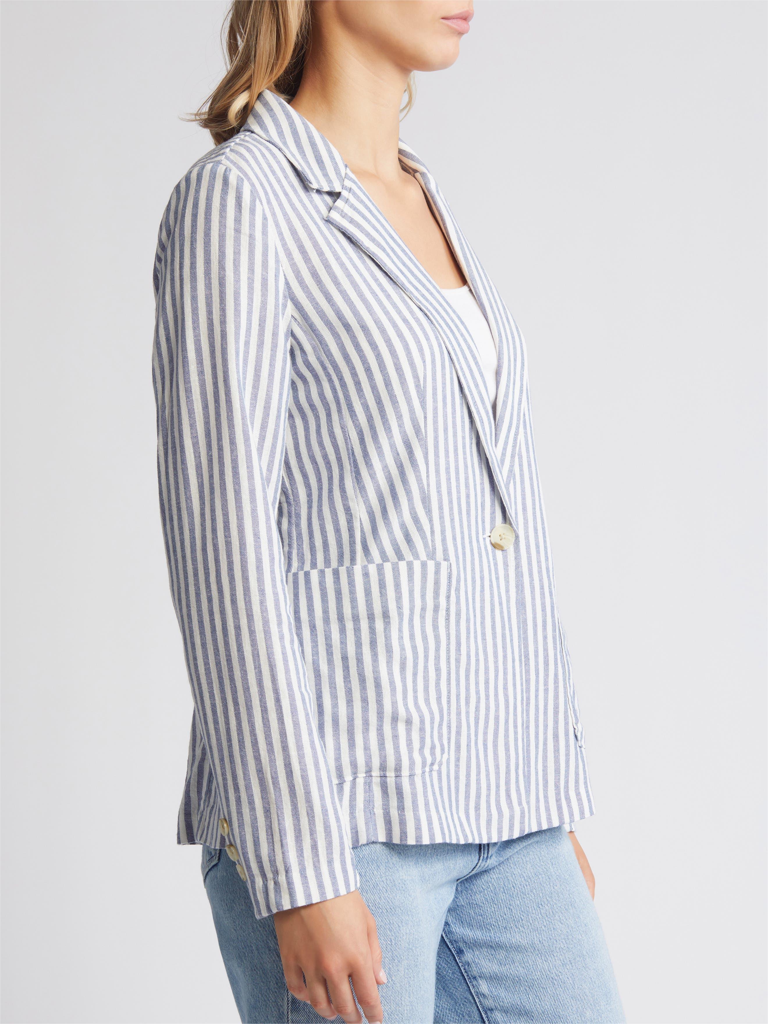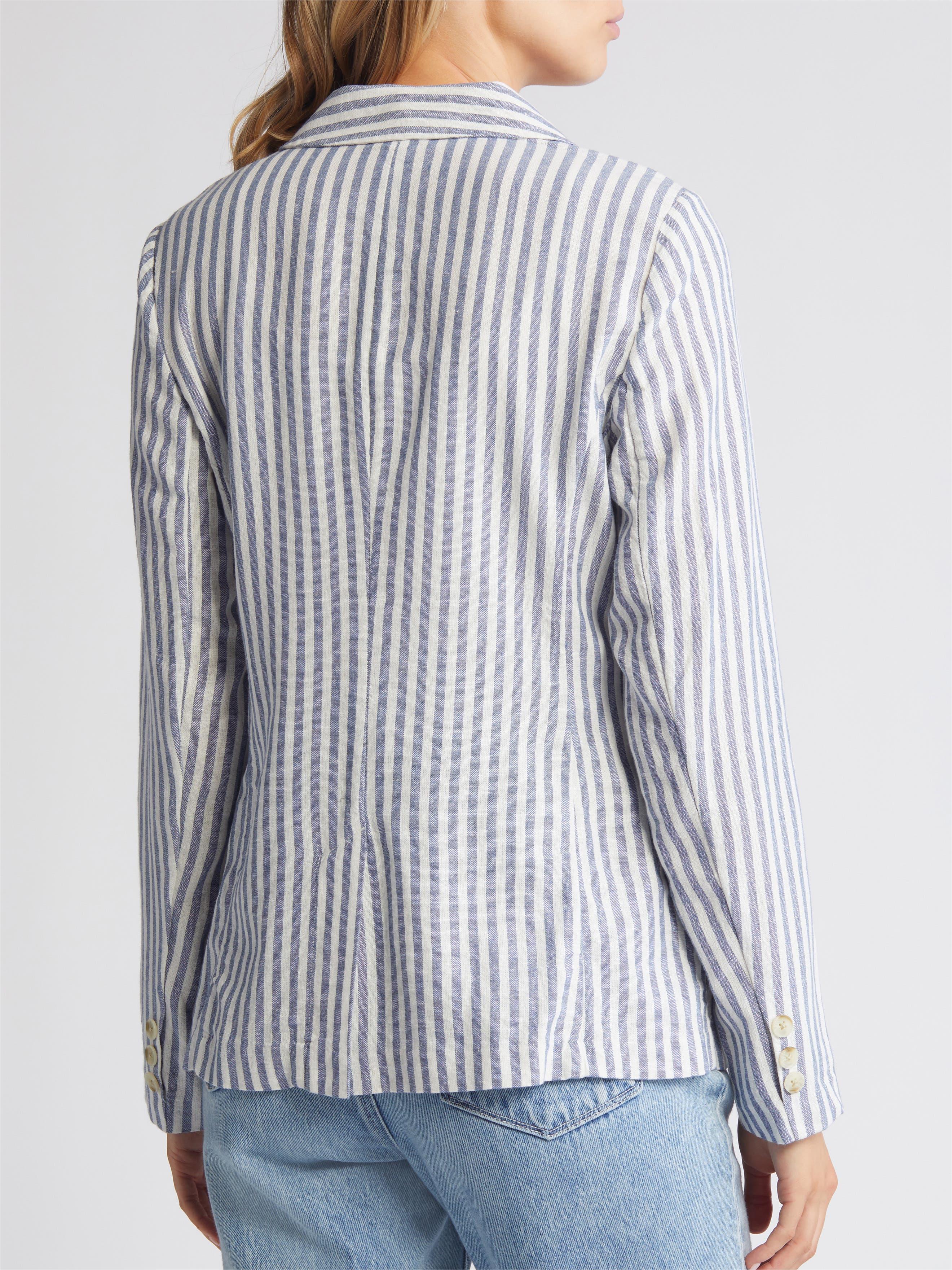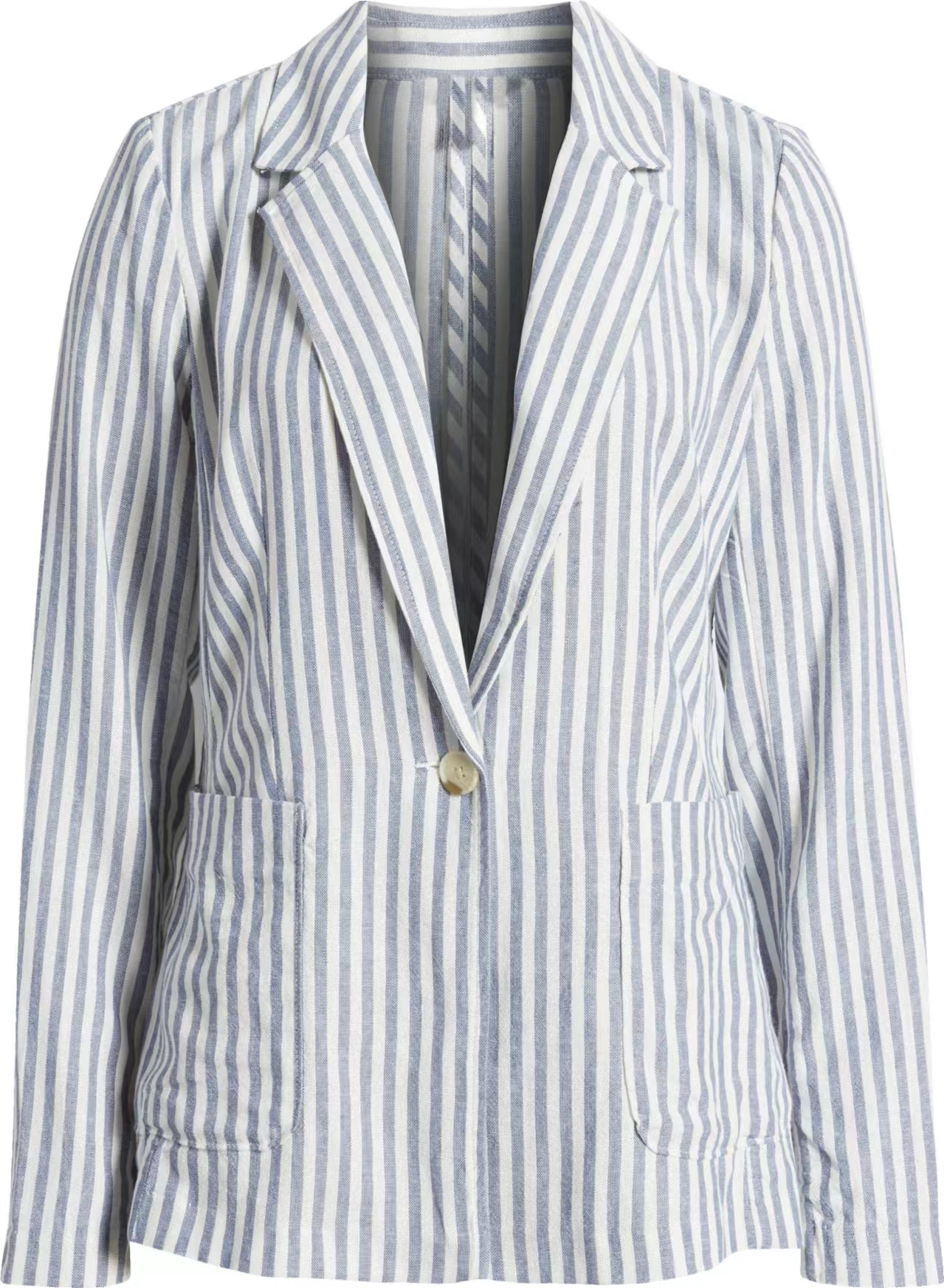 Crisp stripes play up the preppy effect of a one-button blazer in a lightweight linen blend.