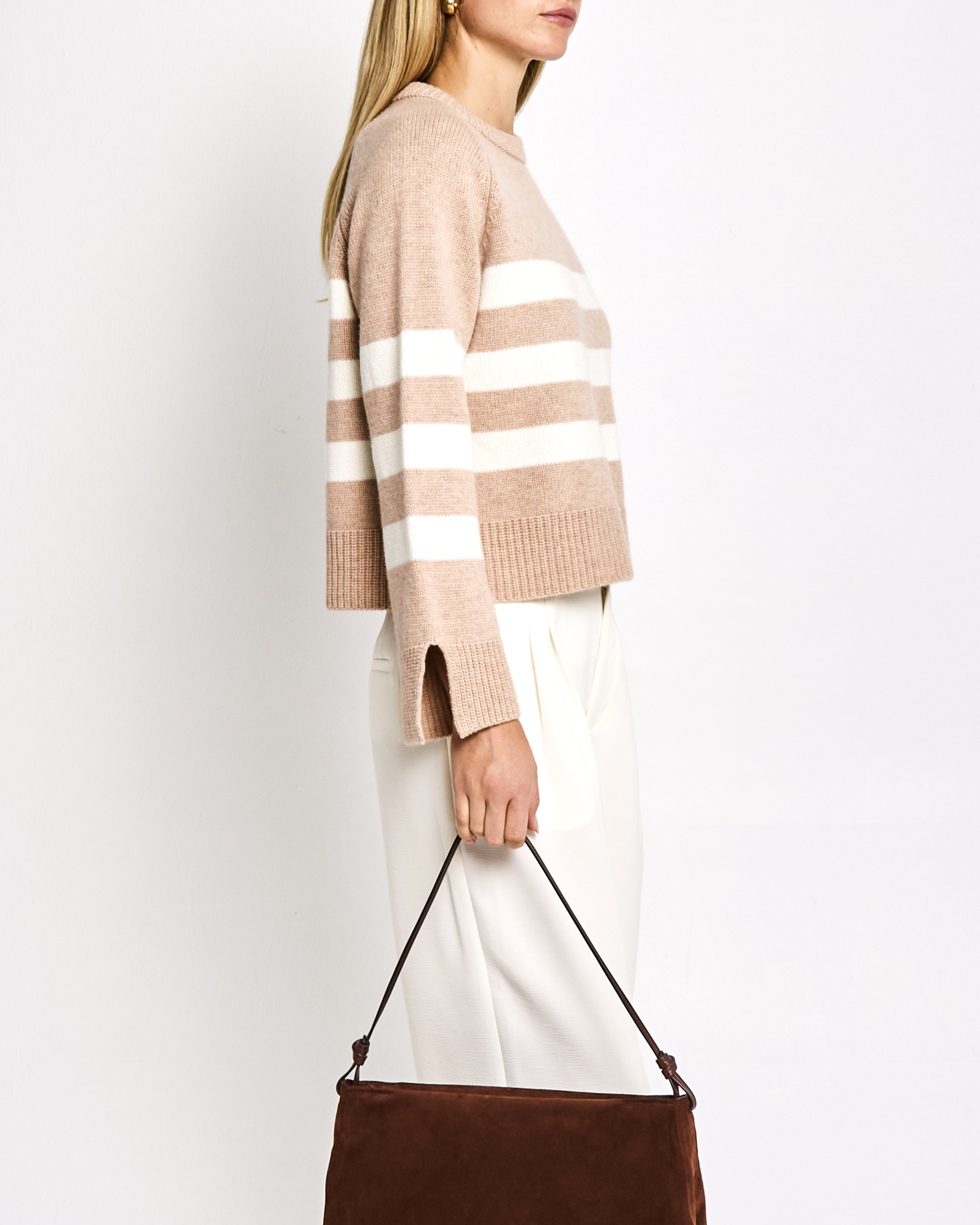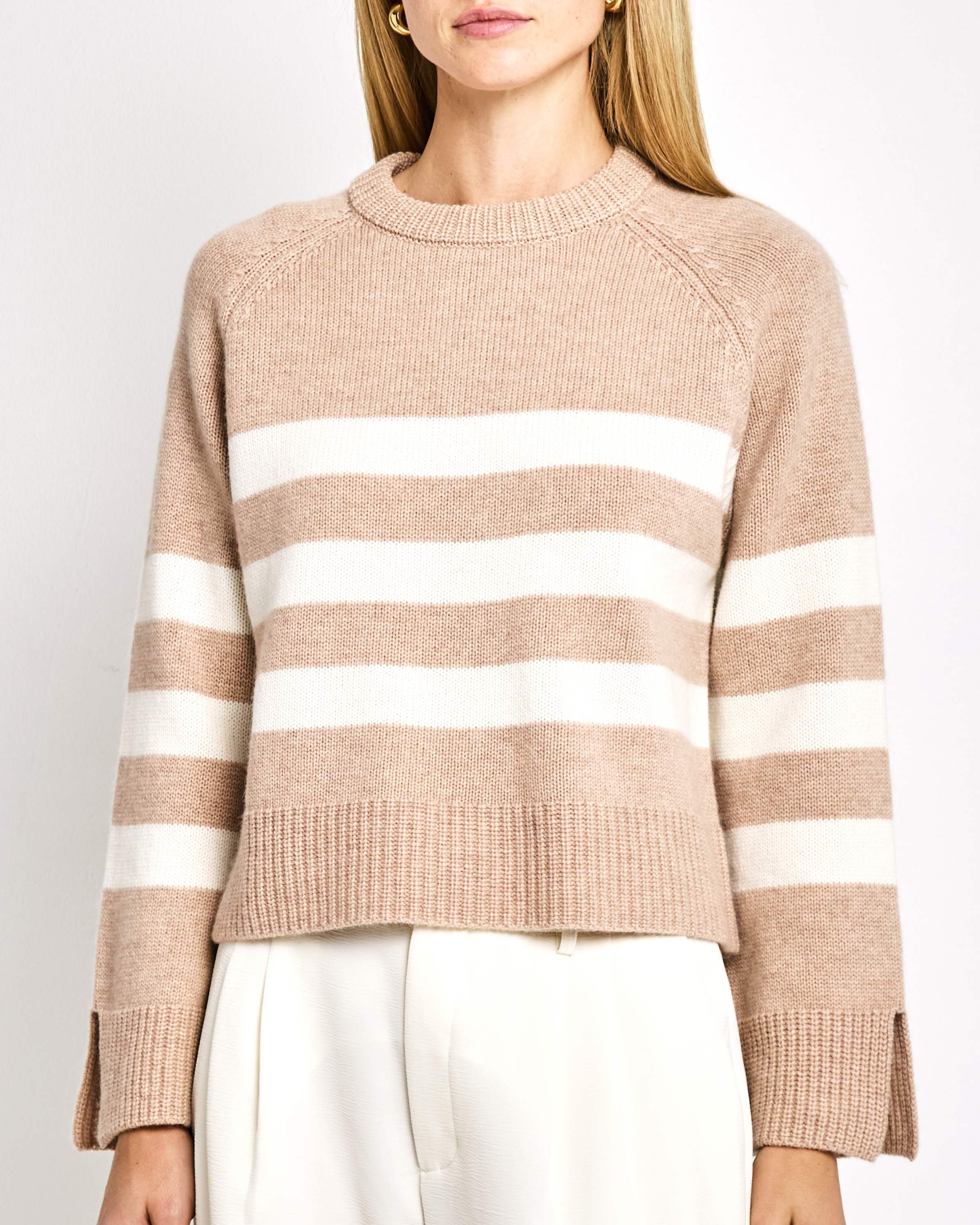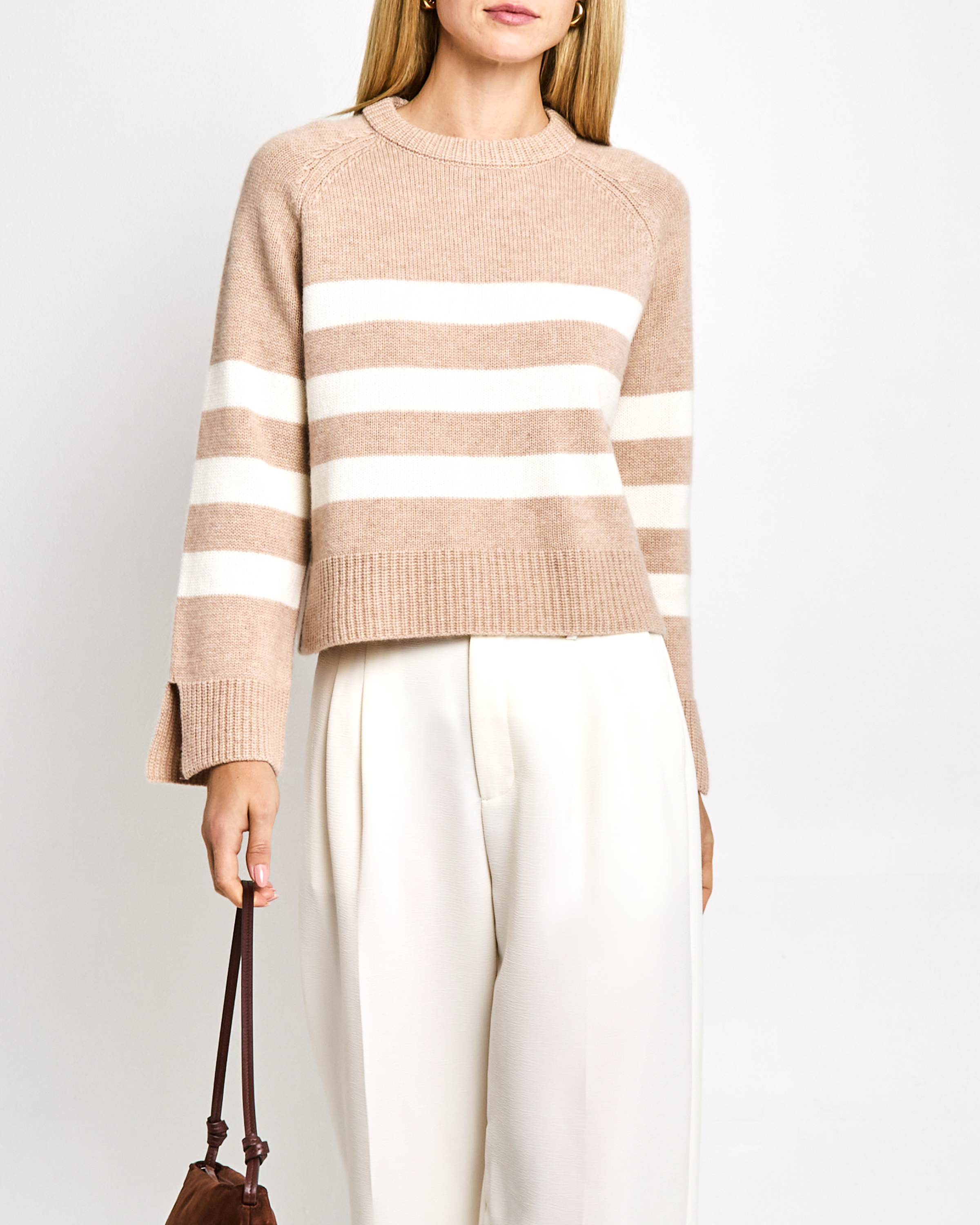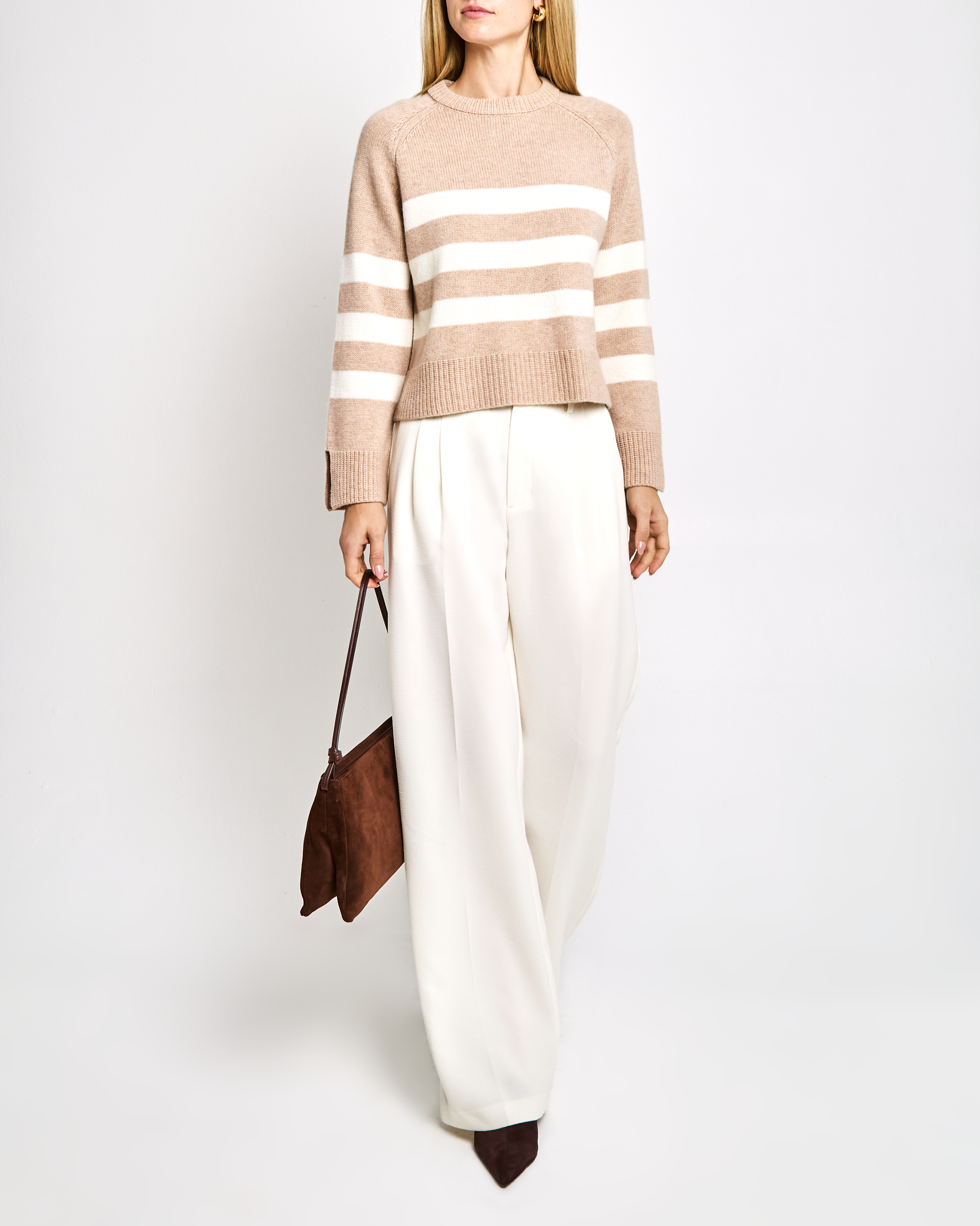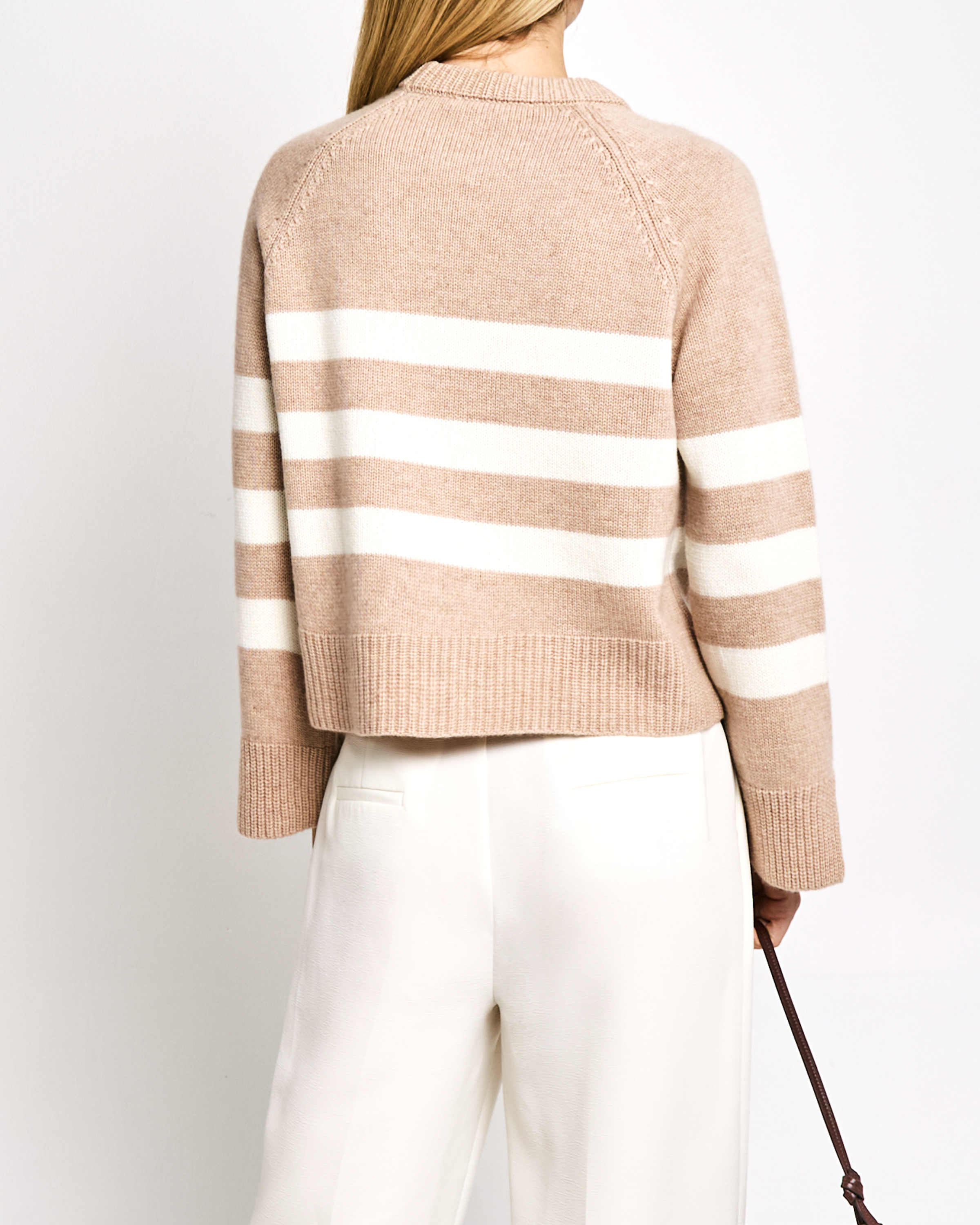 Experience ultimate comfort and style with the sweater. Its luxurious blend of wool and cashmere offers a warm and soft feel. The crewneck, relaxed fit, and striped pattern add a modern touch, while the cropped silhouette ensures a flattering fit.