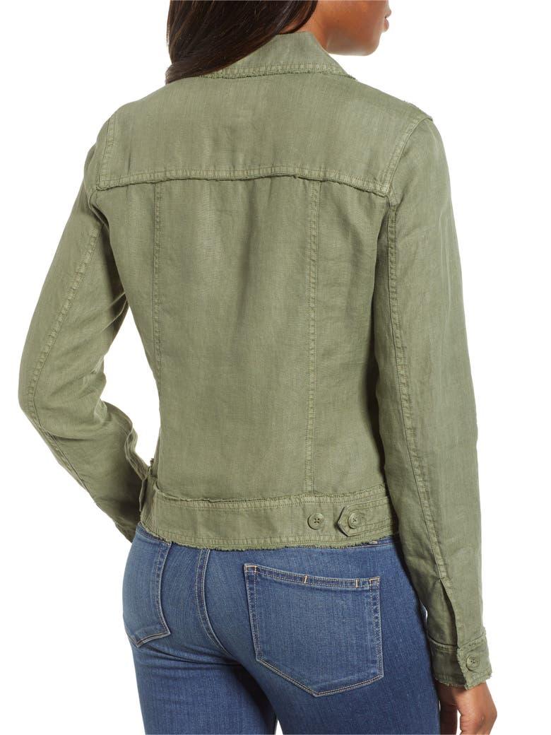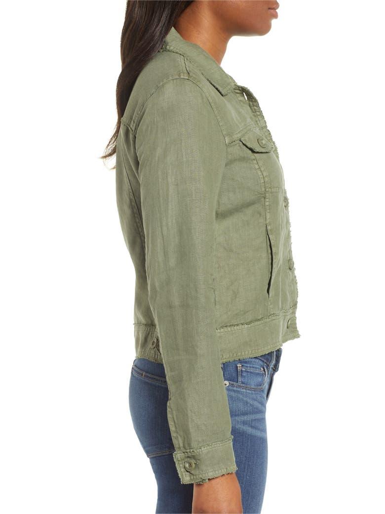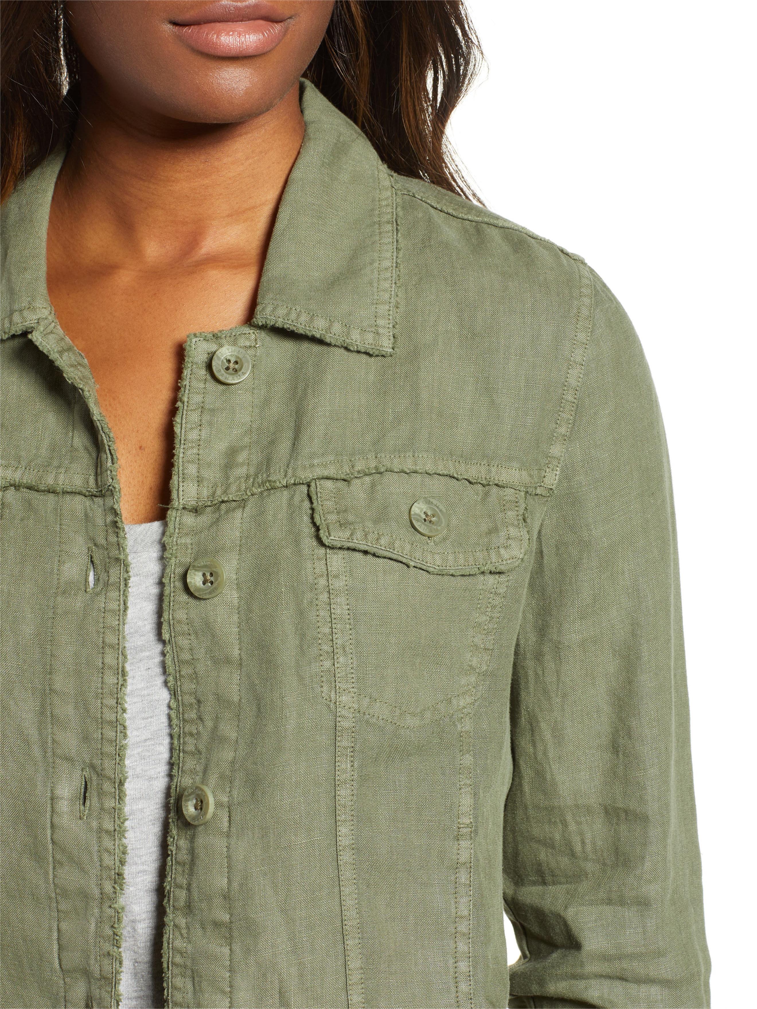 A classic trucker jacket lightens up for cooler weather in a pure linen fabrication in your choice of four versatile hues. Frayed edges add a relaxed, well-worn look.