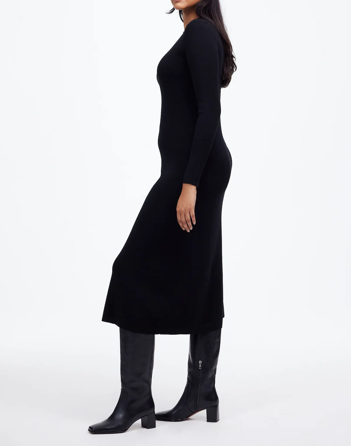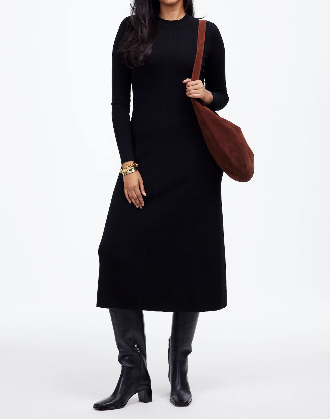 chillier days. This cozy wool sweater dress features a ribbed crewneck and fully fashioned sleeves.